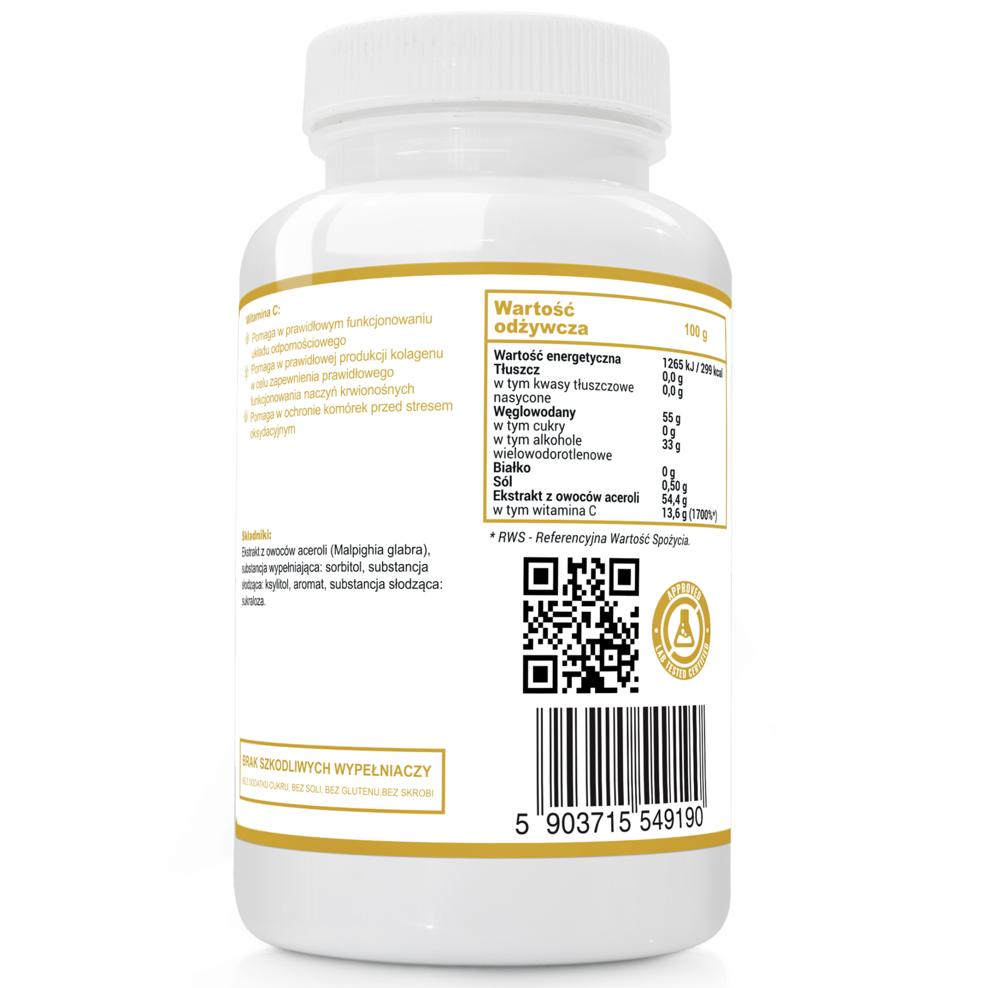 SKŁADNIKI: Extract z owoców aceroli (Malpighia glabra), substancja wypełniająca - sorbitol, substancja słodząca: ksylitol, aromat, substancja słodząca: sukraloza.
