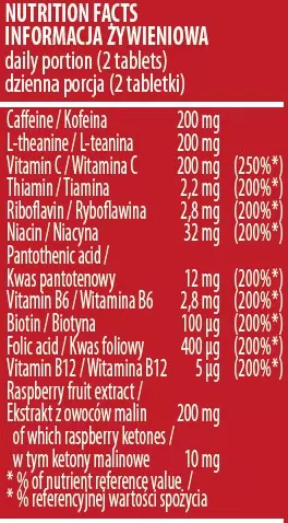 Składniki: Regulator kwasowości: kwas cytrynowy, substancja wypełniająca: sorbitole, regulator kwasowości: wodorowęglan sodu, aromaty, kofeina, L-teanina, kwas L-askorbinowy, ekstrakt z owoców malin (Rubus idaeus), koncentrat buraka czerwonego, witaminy (amid kwasu nikotynowego, D-pantotenian wapnia, chlorowodorek pirydoksyny, ryboflawina, monoazotan tiaminy, kwas pteroilomonoglutaminowy, D-biotyna, cyjanokobalamina), substancja przeciwzbrylająca: glikol polietylenowy, substancja słodząca: sukraloza.