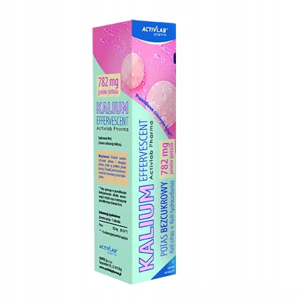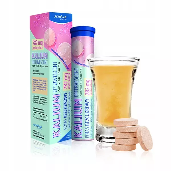 Kalium Effervescent od marki Activlab posiada w swoim składzie cytrynian potasu oraz diwęglan potasu. Suplement nie zawiera w sobie cukru dlatego może być przyjmowany przez diabetyków. Regularna suplementacja potasu wykazuje pozytywny wpływ na układ nerwowy i mięśniowy, a także wspiera utrzymanie odpowiedniego poziomu ciśnienia krwi. Opisywany preparat występuje w formie tabletek o cytrynowym smaku.