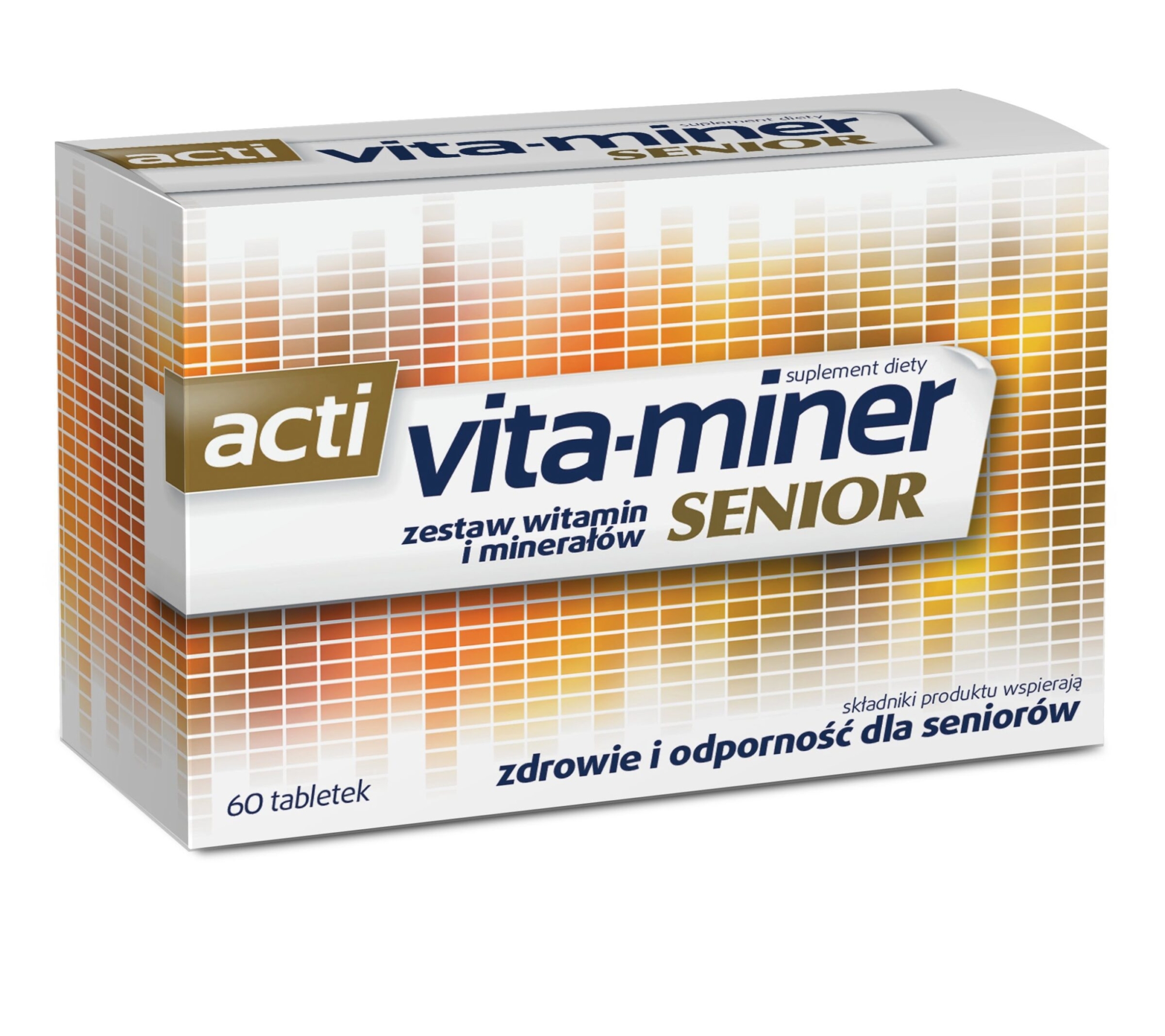 Acti vita-miner Senior to zestaw witamin i minerałów stworzony z myślą o osobach po 50 roku życia. Jego specjalnie dobrane składniki wspierają prawidłowe działanie układu nerwowego (biotyna, jod), utrzymanie sprawności umysłowej (kwas pantotenowy), pomagają w prawidłowym funkcjonowaniu mięśni i w utrzymaniu zdrowych kości (witamina D), zawiera luteinę, witaminę A i cynk, który pomaga w utrzymaniu prawidłowego widzenia, przyczyniają się do regulacji aktywności hormonalnej (witamina B6), wspomagają zachowanie zdrowia i prawidłowe funkcjonowanie układu odpornościowego (kwas foliowy, cynk).