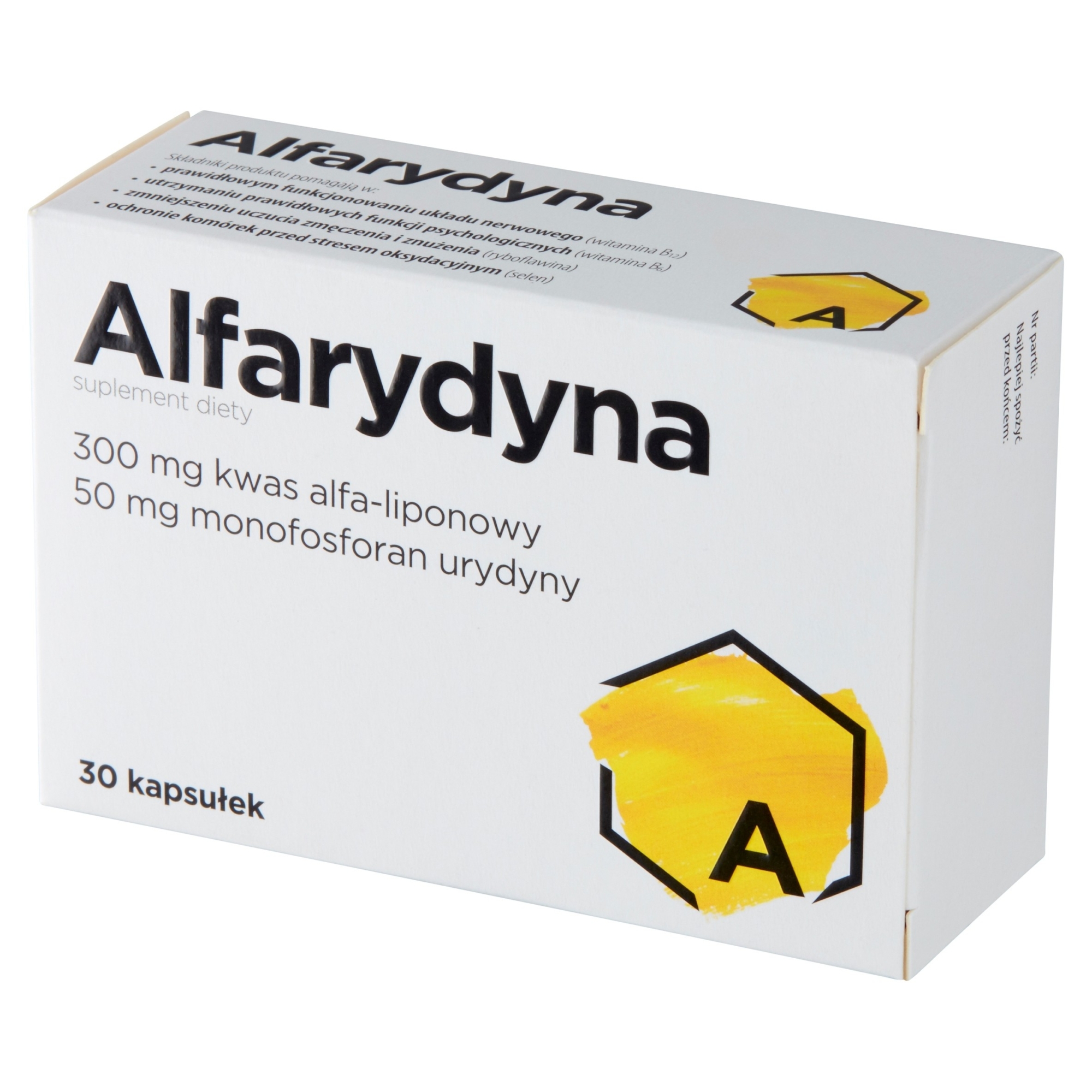 Alfarydyna to połączenie kwasu alfa-liponowego i monofosforanu urydyny.Składniki zawarte w produkcie Alfarydyna pomagają w prawidłowym funkcjonowaniu układu nerwowego (witamina B12) i utrzymaniu funkcji psychologicznych (witamina B6). Ponadto składniki zmniejszają uczucie zmęczenia i znużenia(witamina B2) oraz pomagają w ochronie komórek przed stresem oksydacyjnym (selen).