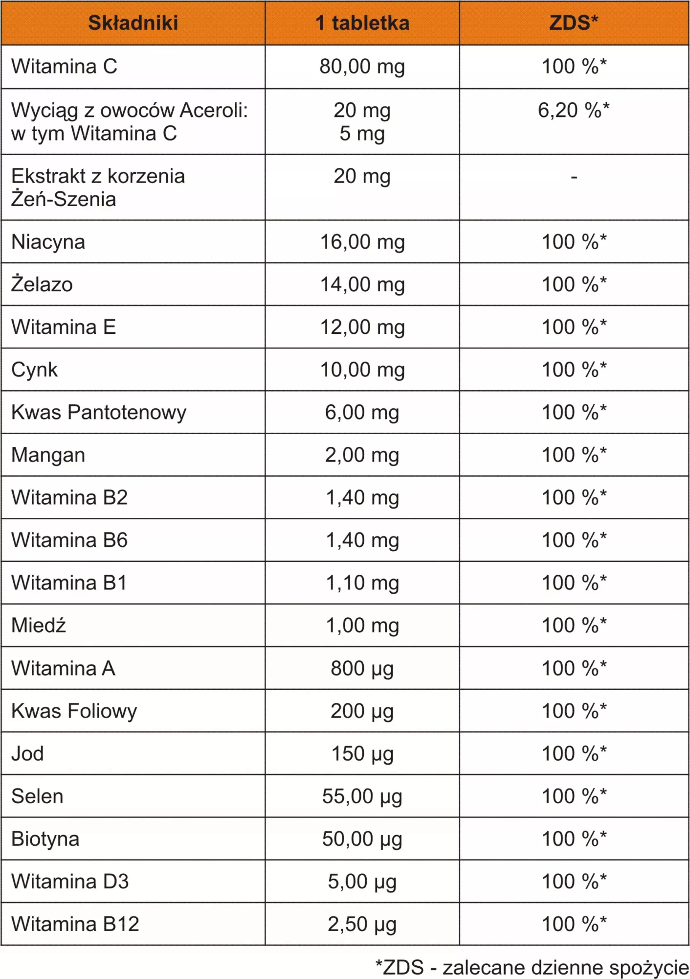 Witaminy i MinerałyDla Całej Rodziny 100%Aliness120 tableteksuplement dietyZalety:✅ Zawiera 20 składników z żeń-szeniem i witaminą C,✅ Wspiera odpornść organizmu,✅ Wspomaga prawidłowe krążenie,✅ Zmniejsza uczucie zmęczenia i znużenia,✅ Zwiększa witalność organizmu. OpisBardzo dobrze skomponowany kompleksowy zestaw witamin i minerałów.Polecane o każdej porze roku dla poprawy funkcjonowania układu odpornościowego i ogólnego wzmocnienia organizmu.1 tabletka na dzień = aż 4 miesiące stosowania________________________________________________________________________Składniki w porcji dziennej 1 tabletkaWitamina C 80 mg (100%*)Wyciąg z owoców Aceroli: 20 mg (6,25%*)w tym Witamina C 5 mgEkstrakt z korzenia Żeń-Szenia 20 mgNiacyna 16 mg (100%*)Żelazo 14 mg (100%*)Witamina E 12 mg (100%*)Cynk 10 mg (100%*)Kwas pantotenowy 6 mg (100%*)Mangan 2 mg (100%*)Witamina B2 1,4 mg (100%*)Witamina B6 1,4 mg (100%*)Witamina B1 1,1 mg (100%*)Miedź 1 mg (100%*)Witamina A 800 mcg (100%*)Kwas foliowy 200 mcg (100%*)Jod 150 mcg (100%*)Selen 55 mcg (100%*)Biotyna 50 mcg (100%*)Witamina D 5 mcg (100%*)Witamina B12 2,5 mcg (100%*)*RWS - Referencyjna Wartość Spożycia________________________________________________________________________