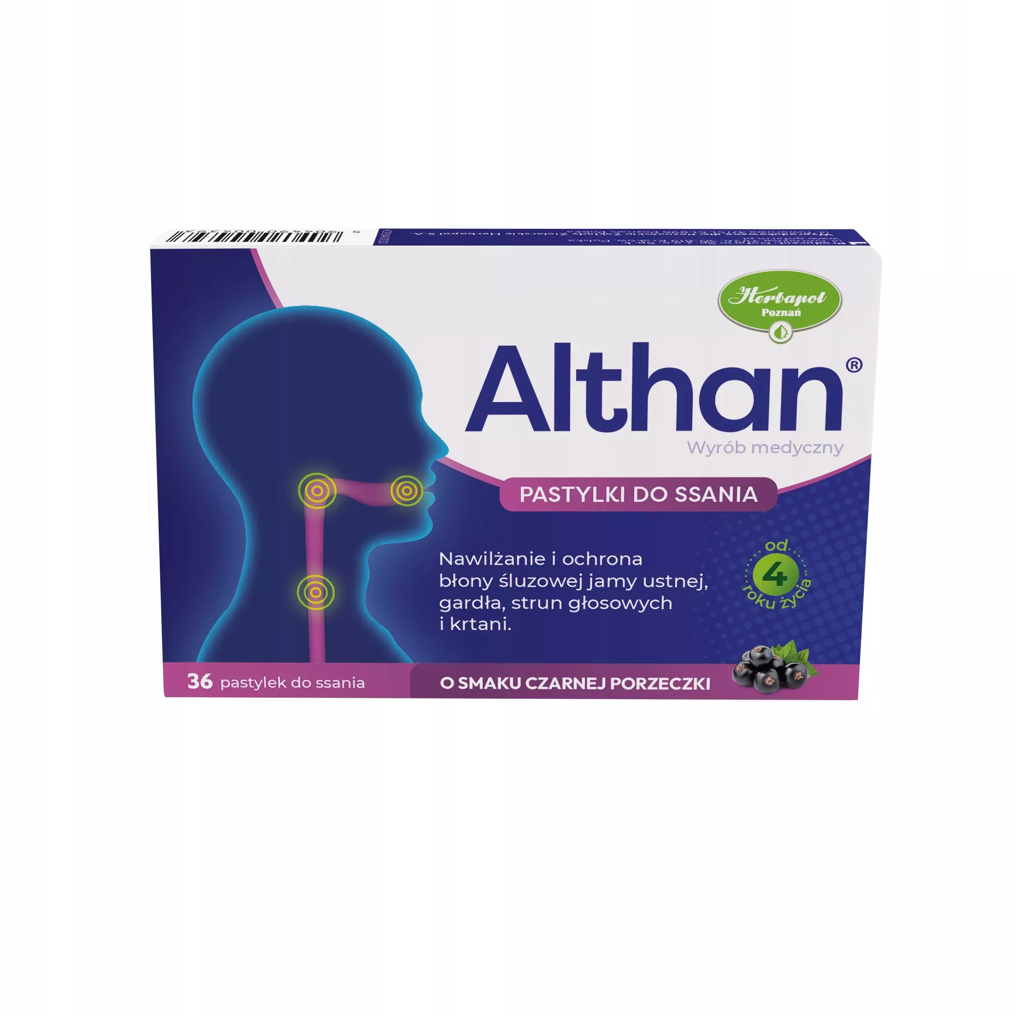 Althan Pastylki do Ssania to wyrób medyczny, który zapewnia nawilżenie i ochronę błony śluzowej jamy ustnej, gardła, strun głosowych i krtani. Dzięki starannie dobranym, naturalnym składnikom, pastylki Althan wspierają w łagodzeniu suchości i podrażnień, sprawiając, że codzienne funkcjonowanie staje się łatwiejsze i bardziej komfortowe.
