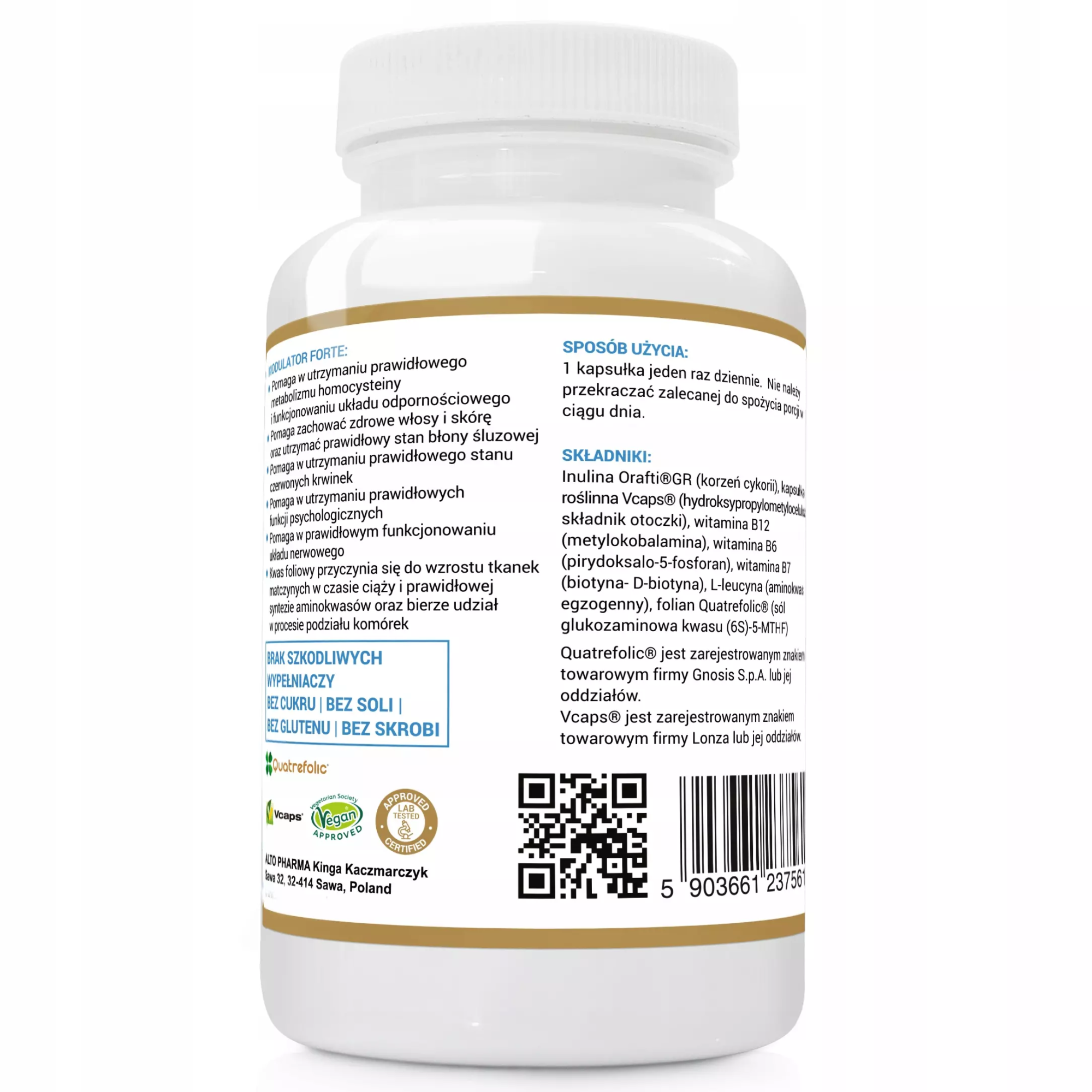 SKŁADNIKI: Inulina Orafti®GR (korzeń cykorii), kapsułka roślinna Vcaps® (celuloza roślinna - hydroksypropylometyloceluloza - składnik otoczki), witamina B12 (metylcobalamina), witamina B6 (pirydoksalo-5-fosforan) witamina B7 (biotyna- D-biotyna), L-leucyna (aminokwas egzogenny), folian Quatrefolic® (sól glukozaminowa kwasu (6S)-5-MTHF)