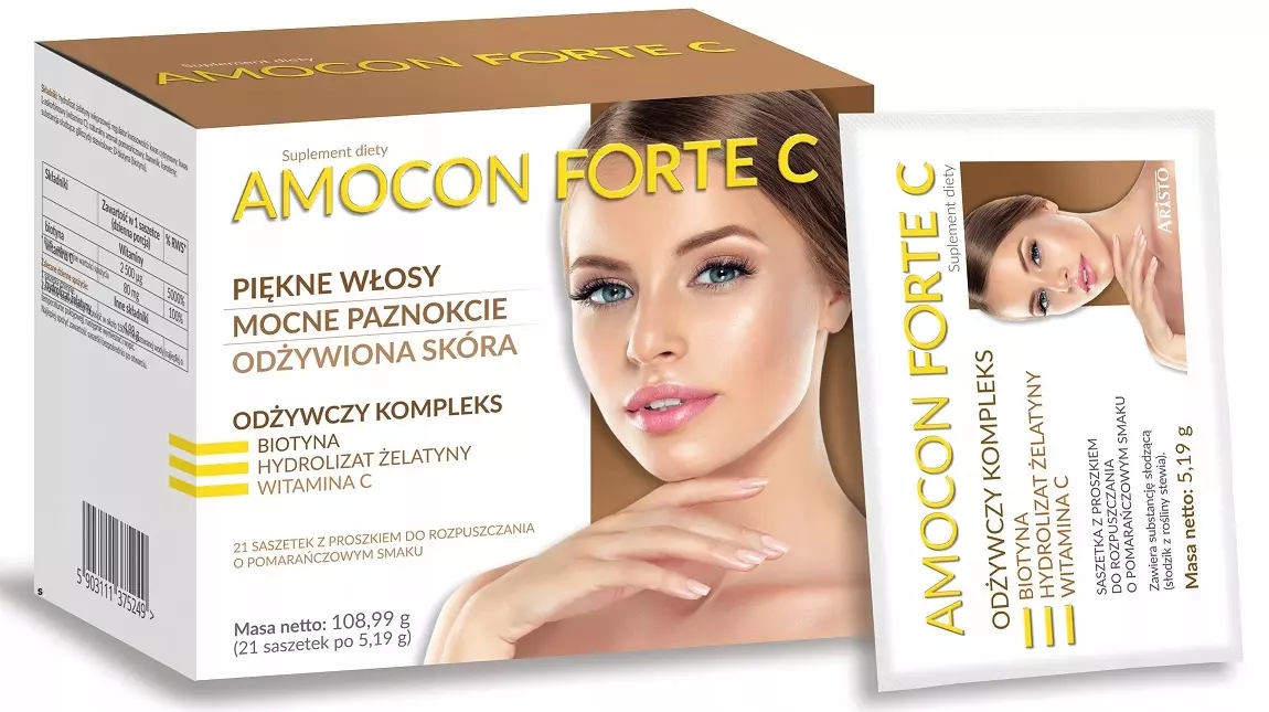 Amocon Forte C jest suplementem diety, który jest źródłem biotyny i witaminy C. Dodatkowo zawiera hydrolizat żelatyny.