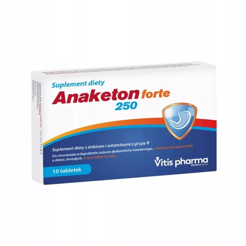 - Anaketon FORTE 250 jest suplementem diety z imbirem i witaminami z grupy B, dla dzieci powyżej 3. roku życia i dorosłych, w tym kobiet w ciąży. Anaketon FORTE 250 w postaci tabletek dojelitowych, pozwala składnikom przejść przez środowisko żołądka bez kontaktu z błonami śluzowymi, co zmniejsza ryzyko skutków ubocznych, np. podrażnienia przewodu pokarmowego i uczucie zgagi.
