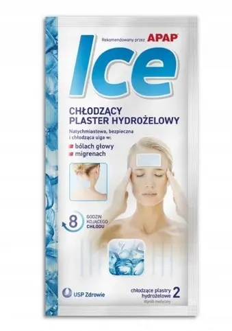 Rekomendowany przez Apap® chłodzący plaster hydrożelowy Ice to wyrób medyczny odpowiedni do stosowania z lekami przeciwbólowymi na ból głowy i migrenę. W opakowaniu znajdują się 2 plastry jednorazowego użytku.