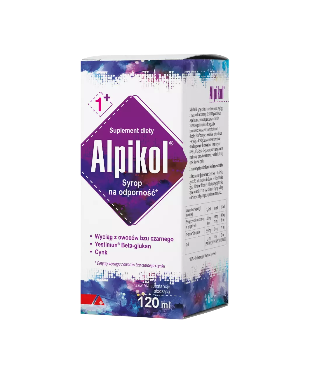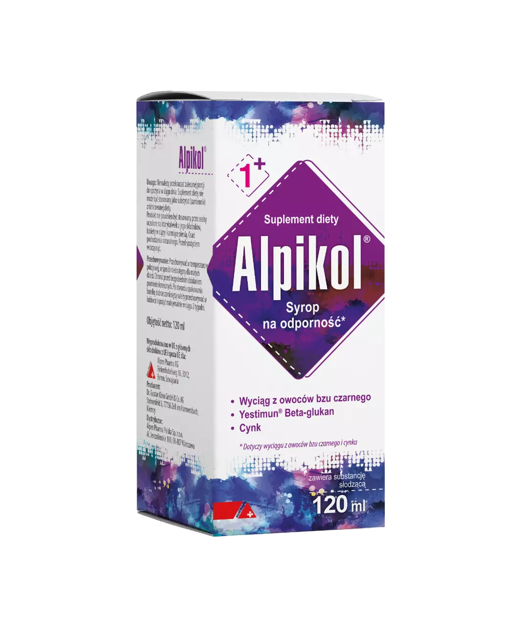 Objętość: 120 ml. Składniki: syrop cukru inwertowanego; wyciąg z owoców bzu czarnego DER 10:1 (Sambucus nigra) standaryzowany do zawartości 10% związków polifenolowych; regulator kwasowości: kwas cytrynowy; Yestimun® z drożdży (Saccharomyces cerevisiae) beta-glukan - wyciąg z drożdży Saccharomyces cerevisiae standaryzowany do zawartości nie mniej niż 80% 1,3-1,6-Beta-D-glukanu; naturalny aromat malinowy; sproszkowane owoce malin (0,13%); cynk: siarczan cynku. Uwaga: Suplement diety nie może być stosowany jako substytut (zamiennik) zróżnicowanej diety. Produkt nie powinien być stosowany przez osoby uczulone na którykolwiek z jego składników, kobiety w ciąży i karmiące piersią. Wyprodukowano w UE z głównych składników z UE i spoza UE dla: Alpen Pharma AG Finkenhubelweg 16, 3012 Berno, Szwajcaria. Producent: Dr. Gustav Klein GmbH & Co. Niemcy. Dystrybutor: Alpen Pharma Polska Sp. z o.o.