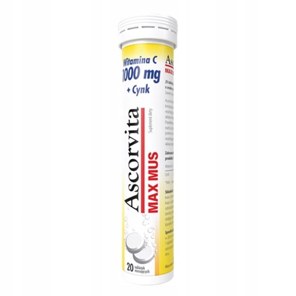 Ascorvita Max mus to suplement diety w formie tabletek musujących o smaku cytrynowym zawierających wysoką ilość witaminy C oraz będących źródłem cynku. Składniki aktywne produktu: