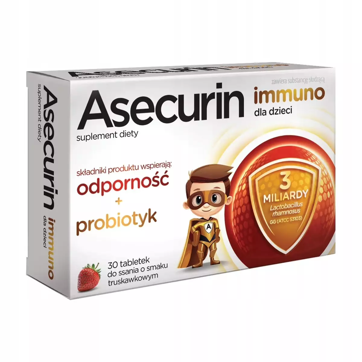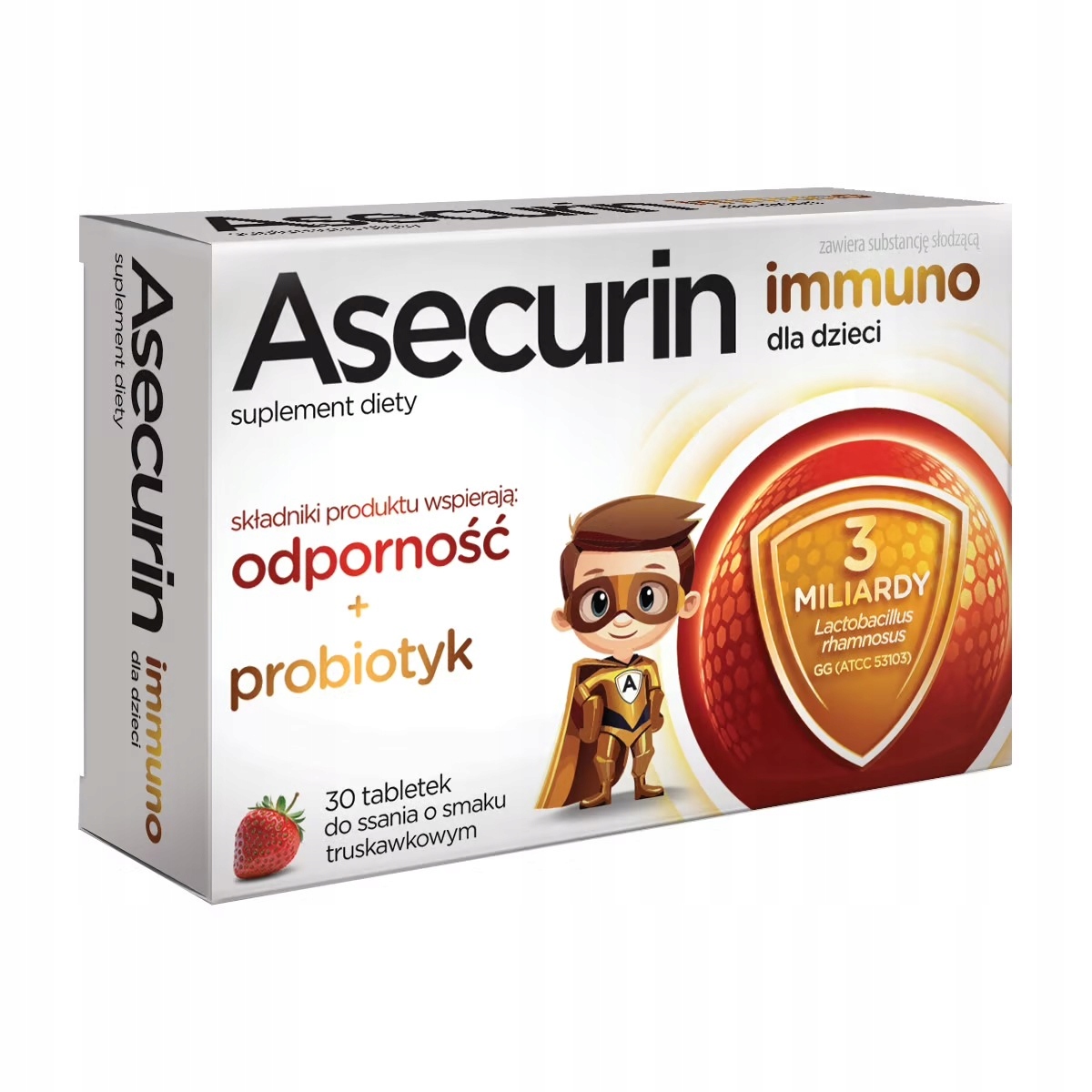 Asecurin Immuno dla dzieci w postaci tabletek do ssania o smaku truskawkowym został stworzony z myślą o dzieciach powyżej 3. roku życia w celu wsparcia układu odpornościowego. Zawiera specjalnie wybrany szczep bakterii probiotycznych Lactobacillus rhamnosus GG, które korzystnie wpływają na uzupełnienie mikroflory jelitowej. Dodatkowo zawiera rutozyd oraz wysokie zawartości takich składników jak witamina C, witamina D, cynk i selen, które pomagają w prawidłowym funkcjonowaniu układu odpornościowego.