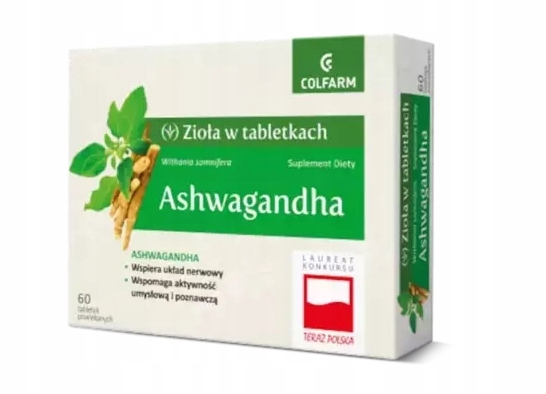 Ashwagandha - suplement diety w postaci tabletek wpływający na dobre samopoczucie i aktywność umysłową. Produkt przeznaczony dla osób dorosłych.