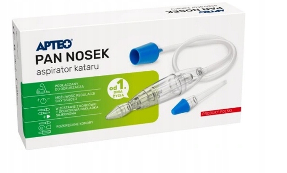 Aspirator kataru Pan Nosek to bezpieczne urządzenie służące do odciągania wydzieliny z nosa u niemowląt, dzieci jak i dorosłych.