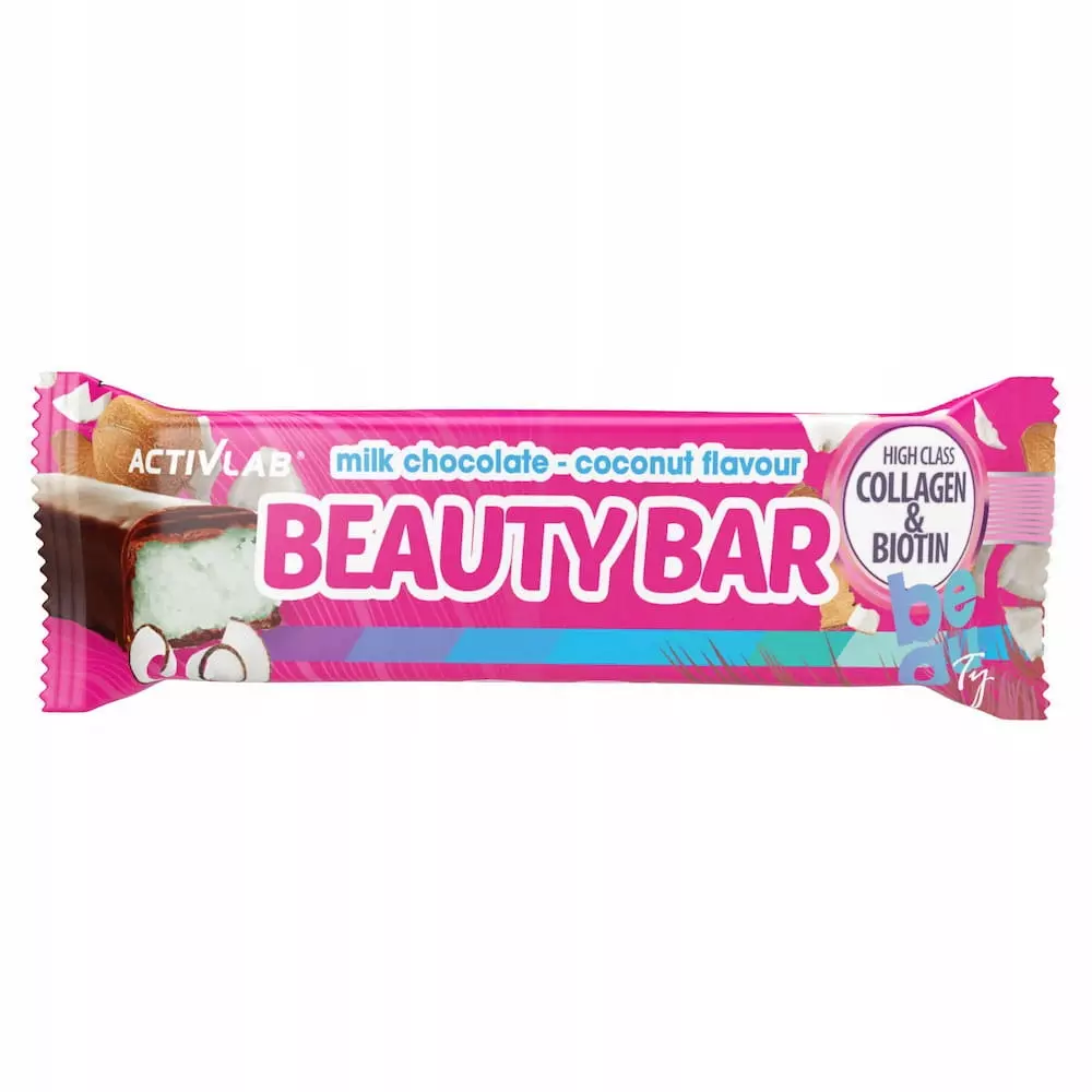 BEAUTY BAR to pyszny baton z wiórkami kokosowymi (35%) w mlecznej czekoladzie (22%) z dodatkiem hydrolizowanego kolagenu i biotyny.