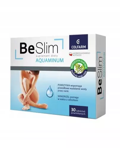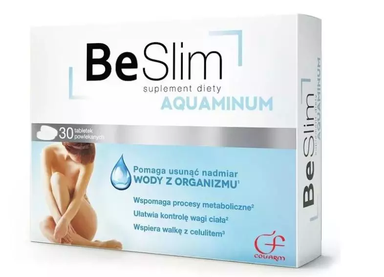 Suplement diety Be Slim Aquaminum zawiera ekstrakty z ziela pokrzywy, zielonej herbaty, owoców winorośli, mniszka, morszczynu pęcherzykowatego oraz opuncji figowej ułatwiające wydalanie nadmiaru wody z organizmu.