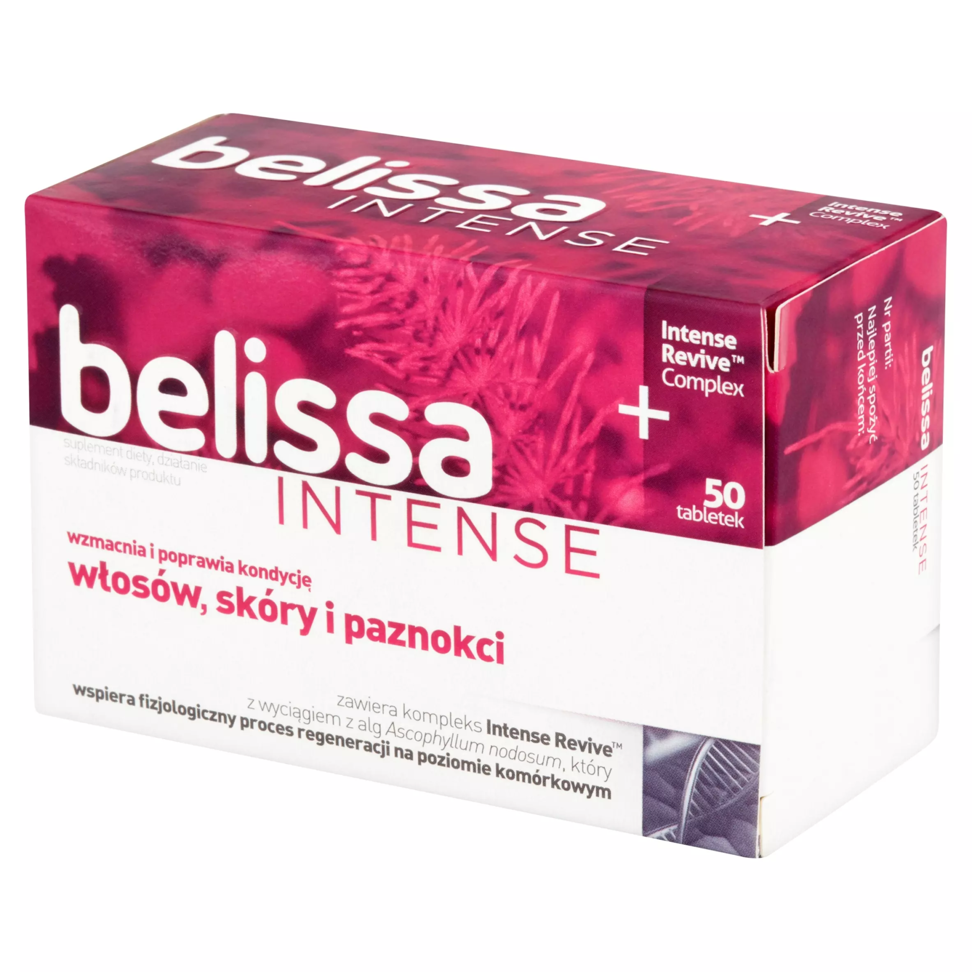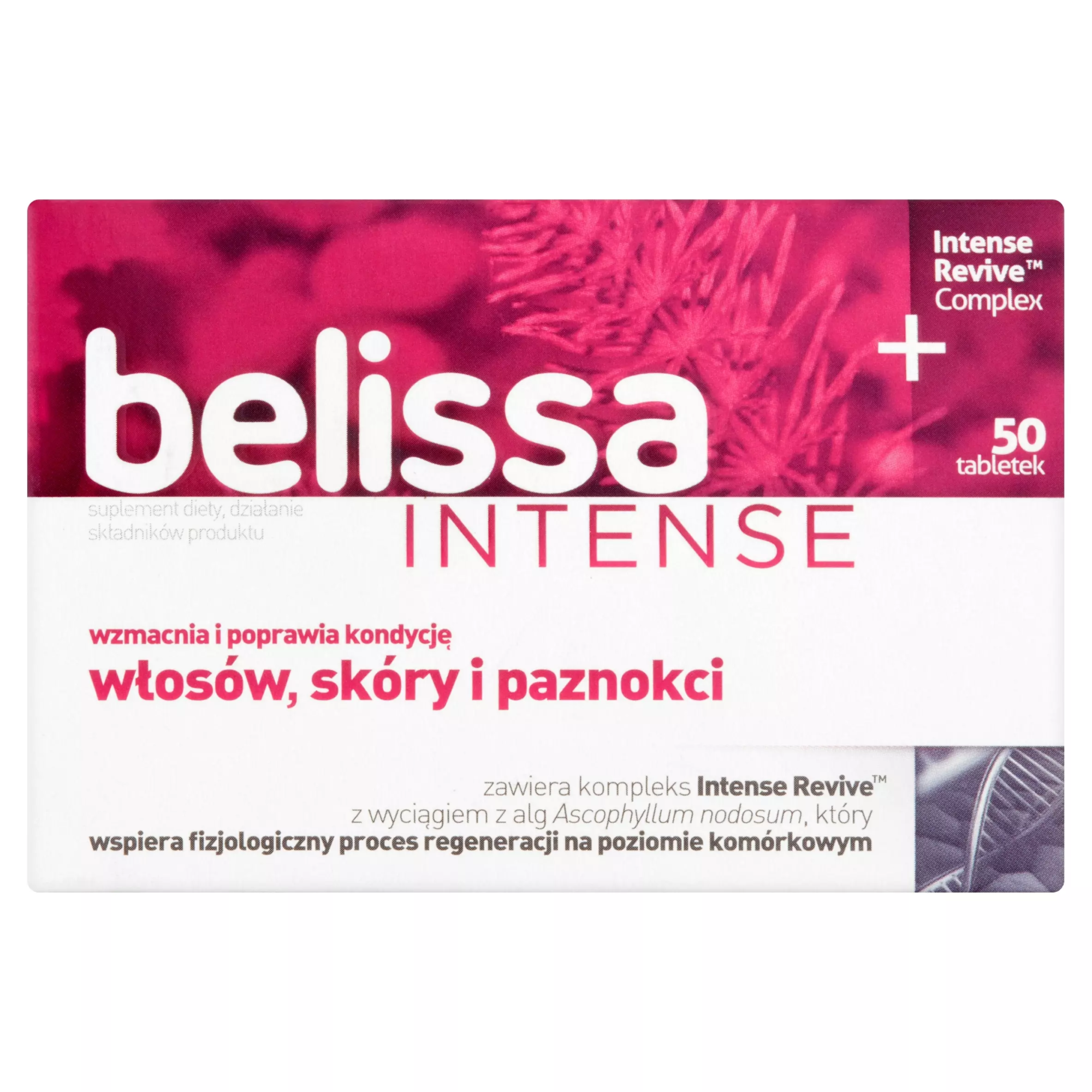 zawiera skoncentrowane składniki, w tym L-cysteinę, biotynę oraz wyciąg ze skrzypu, przyczyniający się do utrzymania właściwej kondycji włosów, skóry i paznokci. Dodatkowo zawarte w preparacie cynk, żelazo, witamina B12 i kwas foliowy, należący do folianów biorą udział w procesie podziału komórek, a witamina A wspiera ich specjalizację. Belissa Intense suplement diety jest wzbogacona kompleksem Intense Revive, zawierającym wyciąg z alg Ascophyllum nodosum, który pomaga skórze zachować równowagę oraz wspiera fizjologiczny proces regeneracji już na poziomie komórkowym.