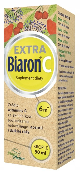 Biaron® C EXTRA to źródło witaminy C ze składników pochodzenia naturalnego: aceroli i dzikiej róży w wygodnej formie kropli. Produkt zawiera składniki wspierające prawidłowe funkcjonowanie układu odpornościowego, układu nerwowego i utrzymanie prawidłowych funkcji psychologicznych. Produkt przeznaczony dla dzieci powyżej 6. miesiąca życia, młodzieży i dorosłych.