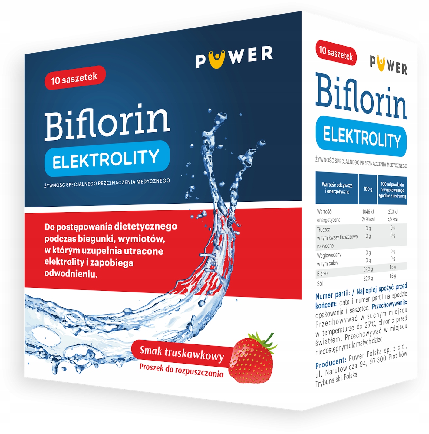 Biflorin ELEKTROLITY to żywność specjalnego przeznaczenia medycznego o smaku truskawkowym. Preparat przeznaczony jest do postępowania dietetycznego podczas biegunki i wymiotów, podczas występowania których skutecznie uzupełnia utracone elektrolity i przeciwdziała odwodnieniu.