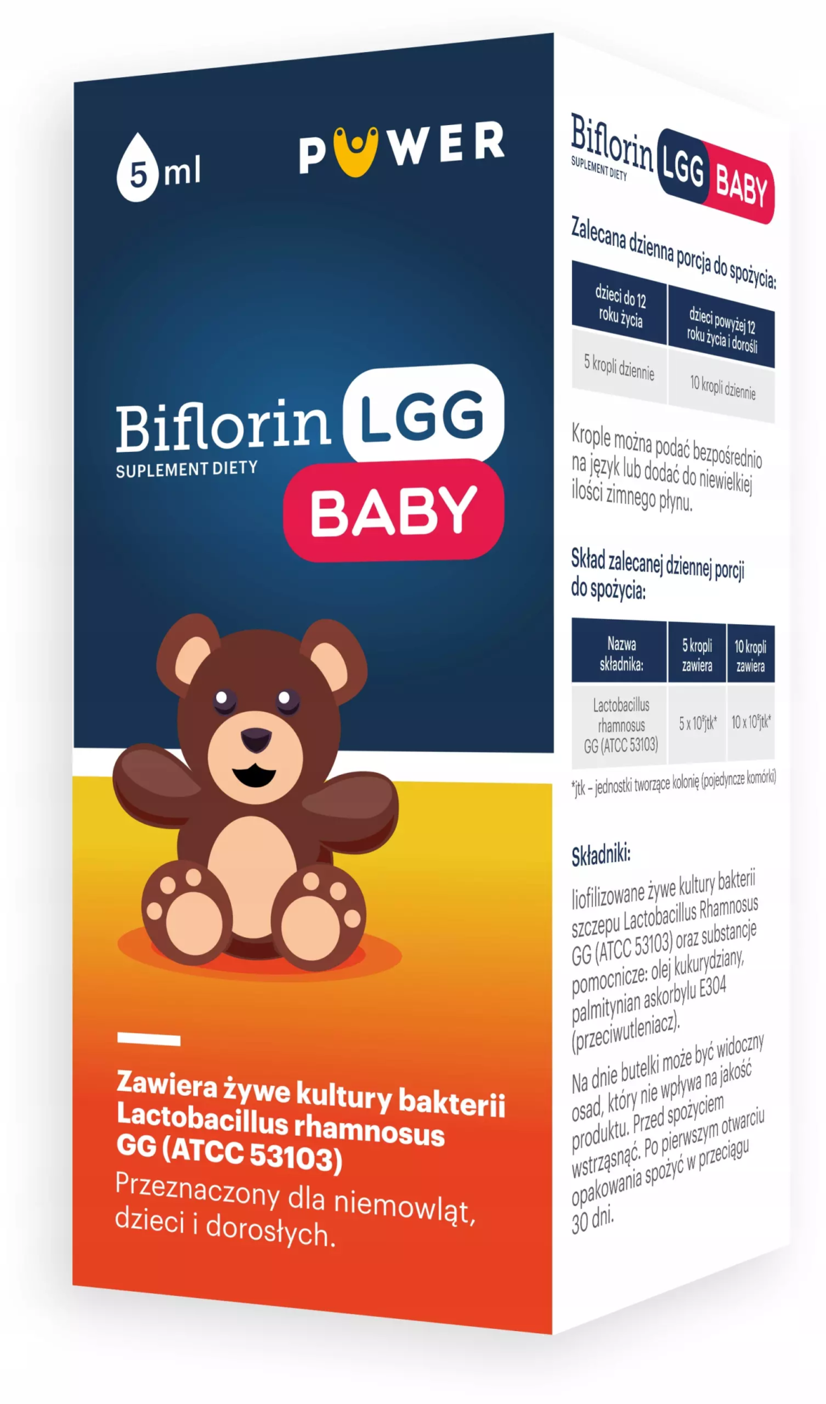 Skład: 5 kropli zawiera 5 mld żywych kultur bakterii bakterii Lactobacillus rhamnosus GG (ATCC 53103).