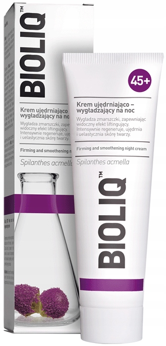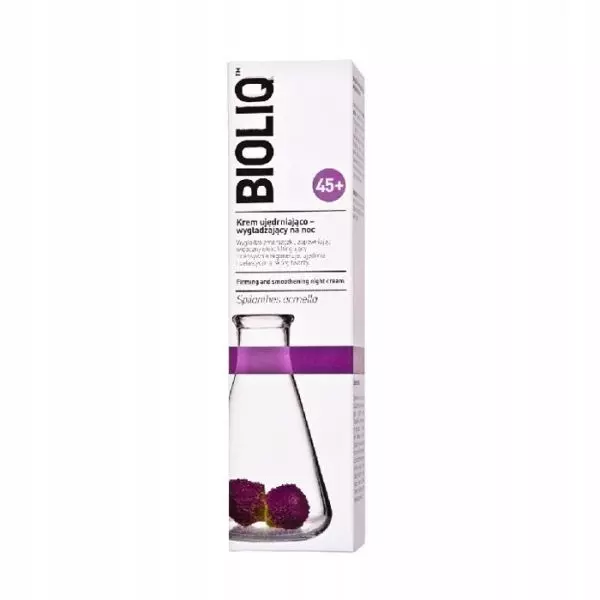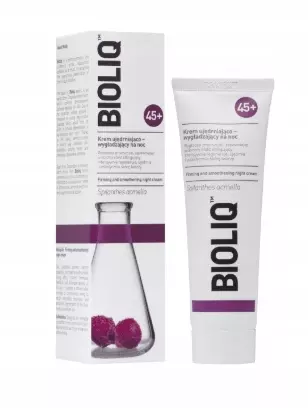 BIOLIQ 45+ Krem ujędrniająco-wygładzający na noc to świetny preparat, który nadaje zauważalny efekt redukcji zmarszczek, wygładzenia skóry oraz poprawy jej napięcia. Kosmetyk gwarantuje wyraźny efekt liftingujący, wygładza skórę oraz poprawia owal twarzy. Redukuje widoczność, gęstość i głębokość zmarszczek. Ponadto zawiera ekstrakt z lilii wodnej (Nymphaea alba), który pobudza metabolizm kolagenu i elastyny, przywracając skórze jędrność, gładkość i znaczną gęstość. Bioliq 45+ działa rozjaśniająco, likwiduje plamki melaninowe oraz wyrównuje koloryt cery. Nawilża, wspomaga regenerację oraz łagodzi podrażnienia. Dodatkowo neutralizuje niebezpieczne działanie wolnych rodników.