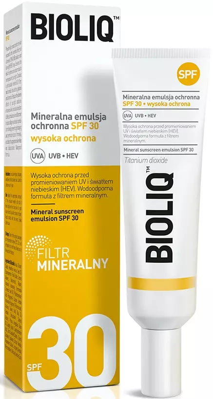 BIOLIQ SPF Mineralna Emulsja ochronna SPF 30 to kosmetyk zapewniający szerokie spektrum działania. Emulsja chroni przed szkodliwym promieniowaniem UVB i UVA oraz skutecznie zabezpiecza skórę przed negatywnym oddziaływaniem światła niebieskiego (HEV). Zastosowano fotostabilny filtr mineralny o większych cząstkach, który nie przenika w głąb skóry. Emulsja dodatkowo zapobiega powstawaniu przebarwień oraz chroni ja przez fotostarzeniem. W trakcie opalania skóra dzięki obecności oleju jojoba, masło shea oraz oleju migdałowego jest odpowiednio nawilżona, natłuszczona i odżywiona.