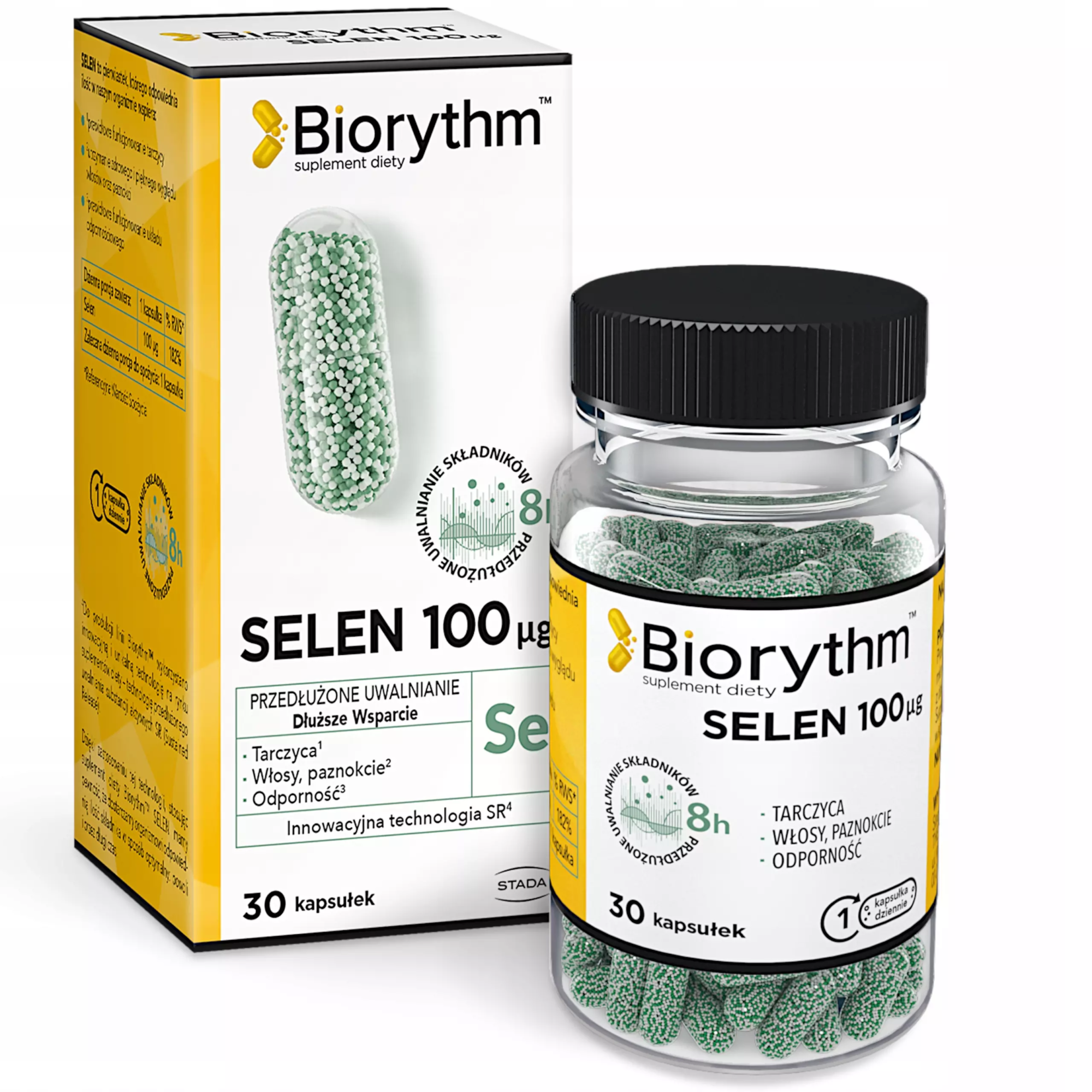 Biorythm Selen 100ug wspiera pracę tarczycy, odporność i stan skóry, włosów i paznokci