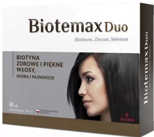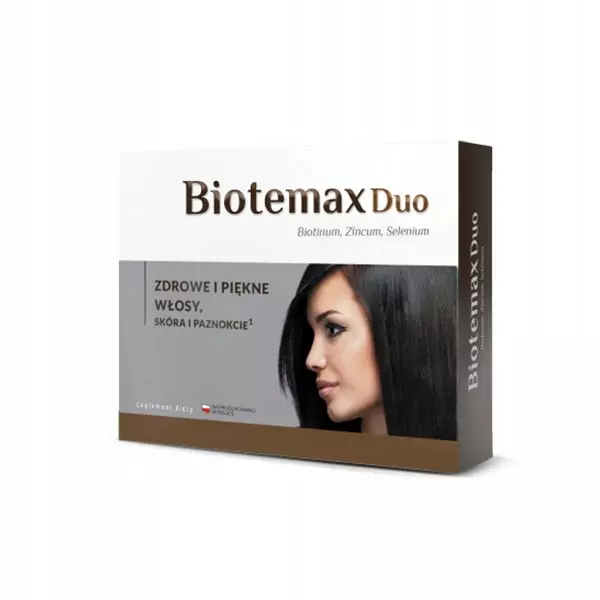 Suplement diety Biotemax Duo zawierający biotynę, cynk i selen. Biotyna pomaga zachować zdrowie włosów, skóry i błon śluzowych. Cynk oraz selen pomagają zachować zdrowe włosy i paznokcie.