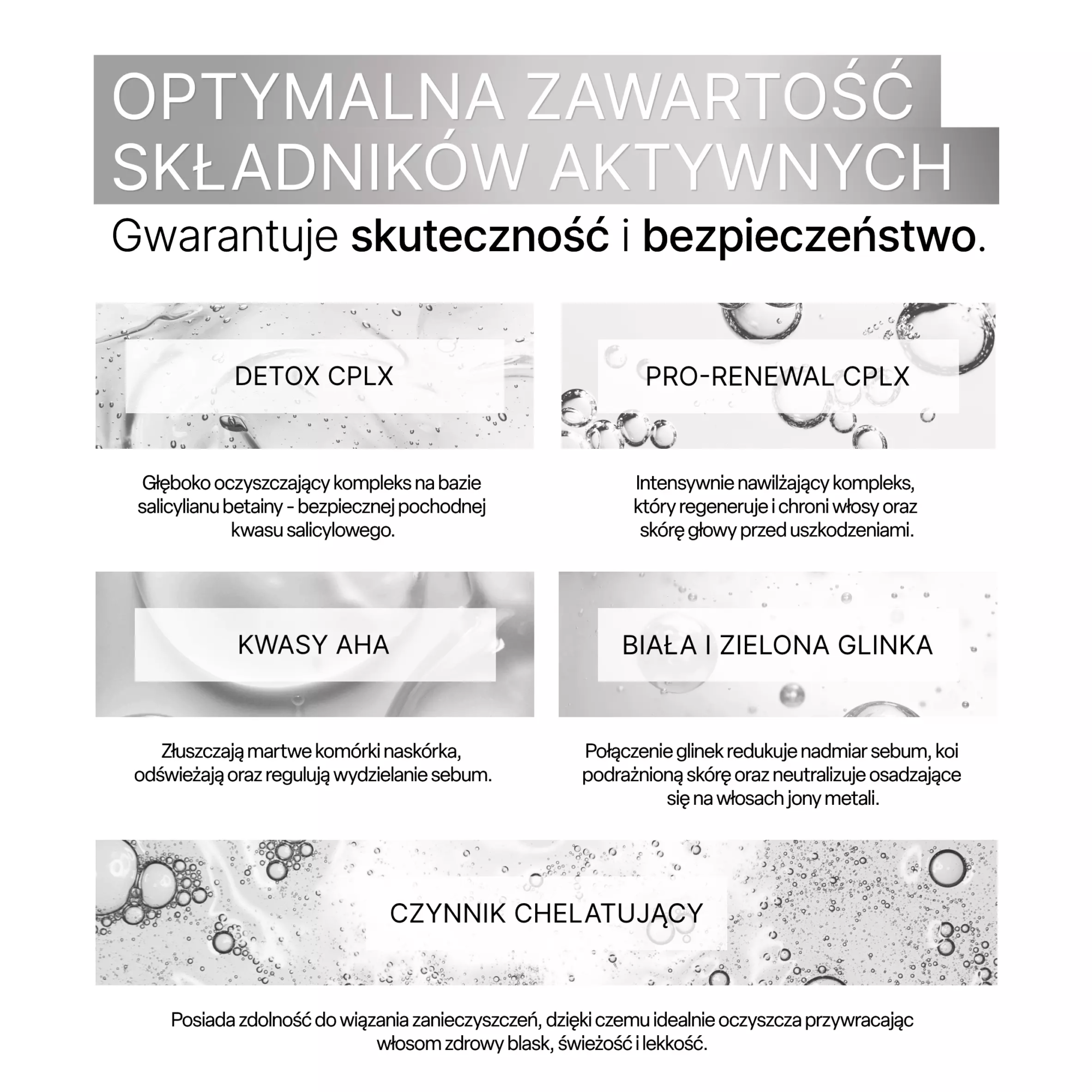 Trychologiczna kuracja detoksykująco-regenerująca. Aktywny Detox CPLX wraz z dodatkiem czynnika chelatującego przeciwdziała przyleganiu osadów, przywracając im lekkość, sypkość i objętość. Naturalne emolienty dogłębnie odżywiają, regenerują oraz zapewniają ochronę przed czynnikami zewnętrznymi. Połączenie glinki zielonej i białej redukuje nadmiar sebum, koi podrażnioną skórę oraz neutralizuje osadzające się jony metali.