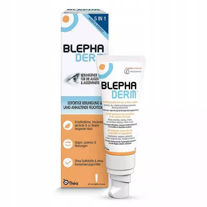 Blephaderm Łagodzący krem na powieki i okolice oczu - skóra wrażliwa, sucha, podrażniona, skłonna do atopii BLEPHADERM to innowacyjny produkt przeznaczony do pielęgnacji okolic oczu, opracowany i przetestowany przez okulistów i dermatologów. Ten krem 5w1 do pielęgnacji skóry wokół oczu natychmiast i trwale łagodzi i nawilża. Regeneruje, chroni skórę wrażliwą i skłonną do atopii oraz zmniejsza obrzęki. Synergia składników pochodzenia naturalnego (kwasu hialuronowego, trehalozy i wyciągu z korzenia konwalnika japońskiego (Ophiopogon japoninicus) w połączeniu z technologią Sterile Cosmetics pozwala na uzyskanie sterylnej, pozbawionej konserwantów kompozycji, która wzmacnia barierę skórną i nie narusza równowagi mikrobioty. Doskonała tolerancja, delikatny dla skóry wokół oczu, idealna baza pod makijaż, łatwy w użyciu, nieklejący, nietłusty. Jak stosować? Nakładać rano i wieczorem na powieki i okolice oczu. Produkt może być również stosowany na całą twarz. Po każdym użyciu należy wytrzeć końcówkę tubki i nałożyć nasadkę. Składniki Kremu Blephaderm: Aqua (Water), Oleyl Erucate, Trehalose, Sodium Acrylates Copolymer, Lecithin, Ophiopogon Japonicus Root Extract, Hydrolyzed Hyaluronic Acid, Maltodex Trin, Tocopherol, Sodium Hydroxide, Phytic Acid, Glycine Soja (Soybean) Oil, Helianthus Annuus Seed Oil.