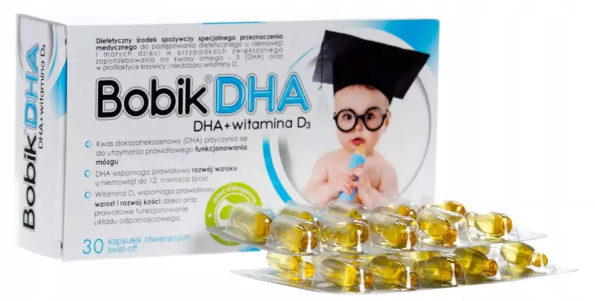Suplement diety Bobik DHA dla dzieci i niemowląt ma postać kapsułek twist-off, zawierających kwas DHA (dokozaheksaenowy) i witaminę D. Składniki aktywne są zawieszone w oliwie z oliwek, dzięki czemu produkt może być stosowany niezależnie od posiłku, ułatwiając ich wchłanianie. Każda kapsułka twist-off zawiera 150 mg kwasu DHA i 400 j.m. witaminy D. Kwas DHA zaliczany jest do wielonienasyconych kwasów tłuszczowych z grupy omega-3. Przyczynia się do prawidłowego rozwoju wzroku niemowląt do 12. miesiąca życia (korzystny efekt występuje w przypadku spożycia 100 mg DHA dziennie). Witamina D wspiera prawidłowe funkcjonowanie układu odpornościowego u dzieci. Jest również potrzebna maluszkom do prawidłowego wzrostu i rozwoju kości.