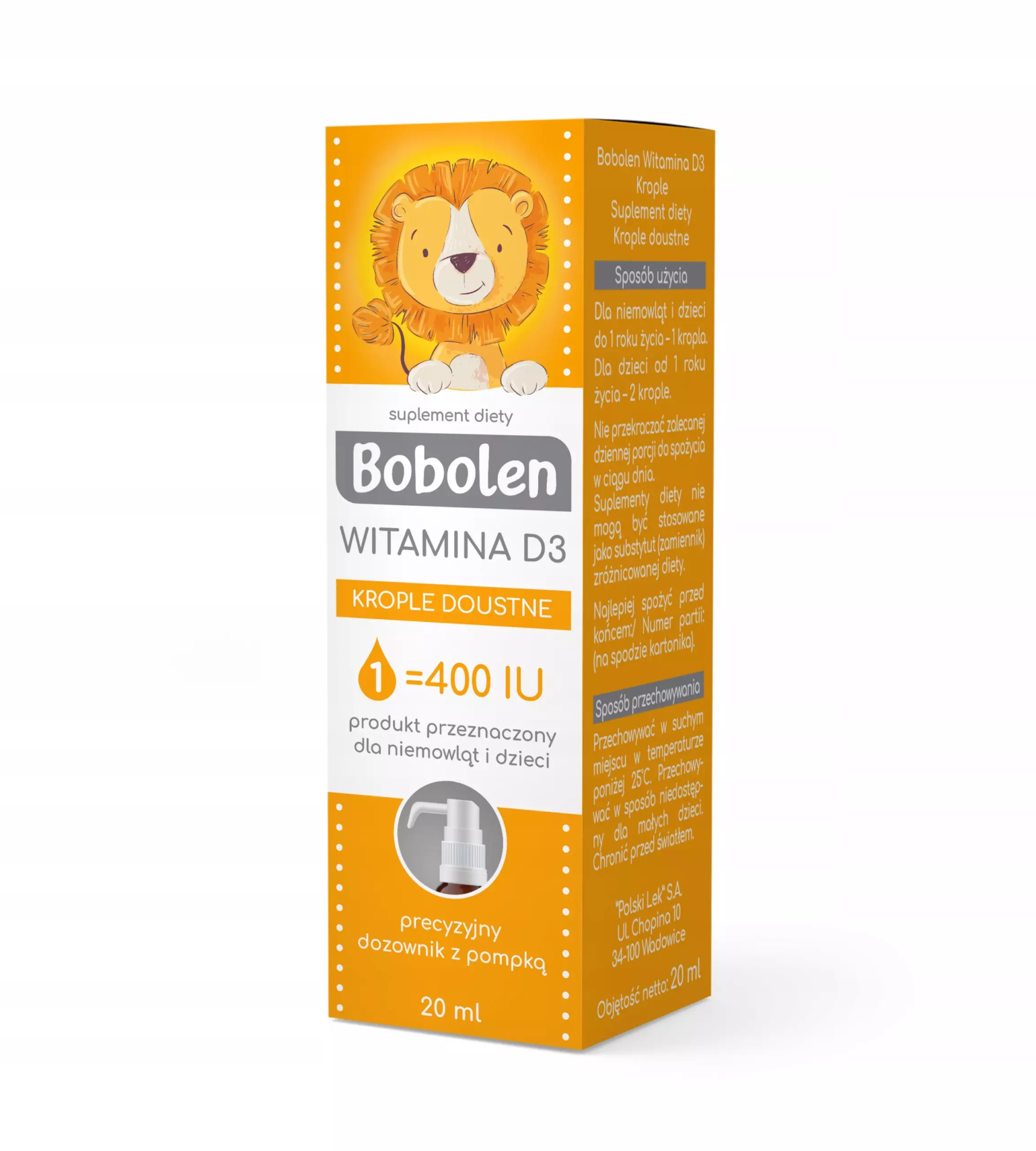 Bobolen Witamina D3 krople zawiera witaminę D, która przyczynia się do prawidłowego funkcjonowania układu odpornościowego u dzieci oraz jest potrzebna do prawidłowego wzrostu i rozwoju kości u dzieci.