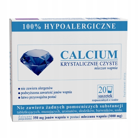Calcium Krystalicznie Czyste nie zawiera żadnych pomocniczych substancji tabletkujących, musujących, aromatów, słodzików, barwników, sodu. Posiada łatwoprzyswajalną postać. Polecane jest w celu uzupełnienia diety w wapń, szczególnie dla osób uczulonych na niektóre substancje dodatkowe występujące w tabletkach musujących.