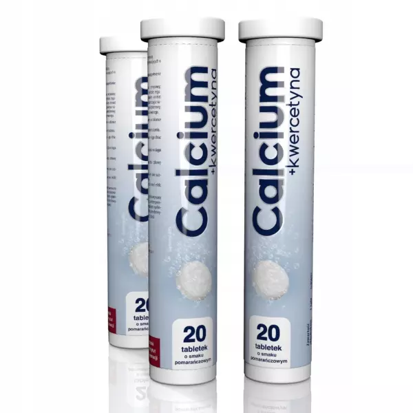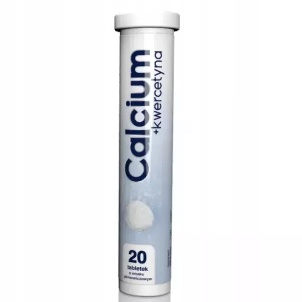 Suplement diety w postaci tabletek musujących o smaku pomarańczowym zawiera w składzie wapń i kwercetynę.