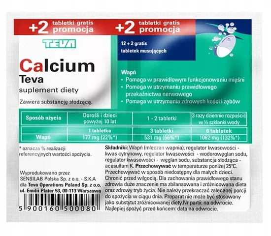 Suplement diety TEVA Calcium zawiera wysoką dawkę wapnia. Produkt odpowiedni dla osób dorosłych oraz dzieci powyżej 10. roku życia.