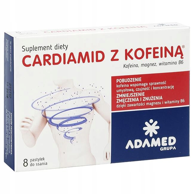 CARDIAMID z KOFEINĄ suplement diety zawiera kofeinę. Kofeina pomaga w poprawie koncentracji. Wyciąg z guarany pomaga w zmniejszeniu zmęczenia psychicznego. Produkt zawiera magnez i witaminę B6, które przyczyniają się do zmniejszenia uczucia zmęczenia i znużenia oraz do utrzymania prawidłowego metabolizmu energetycznego. Witamina B6 pomaga w utrzymaniu prawidłowego metabolizmu homocysteiny, której właściwe stężenie w organizmie wpływa na prawidłową pracę serca i układu krążenia.