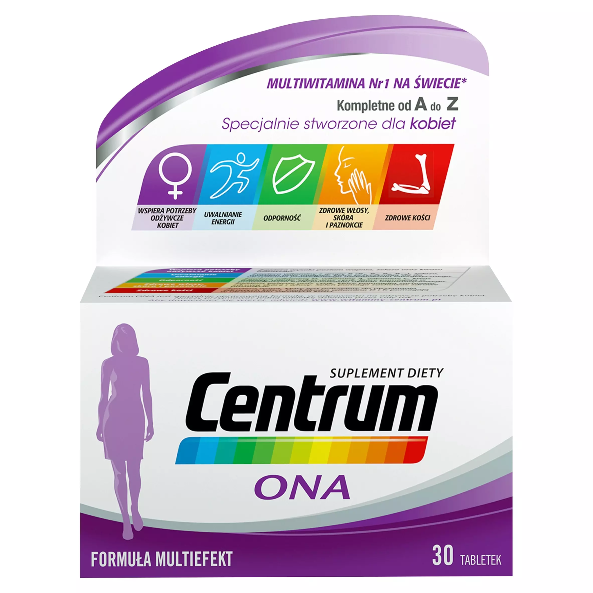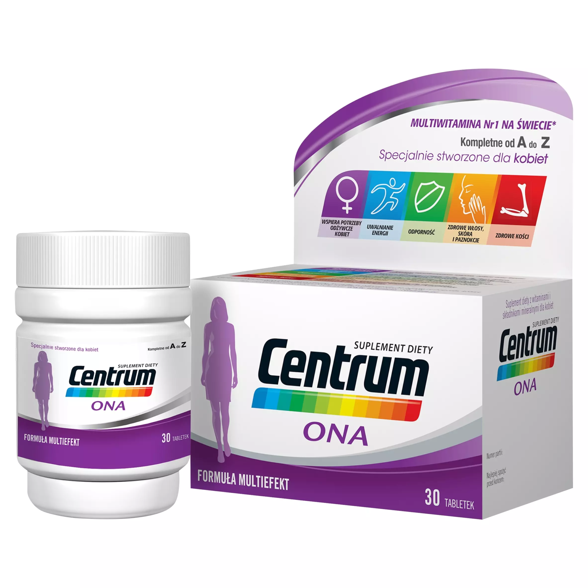 Centrum ONA to kompletny zestaw witamin i minerałów dla kobiet, zawierający 24 składniki ważne dla ich zdrowia i dobrego samopoczucia.