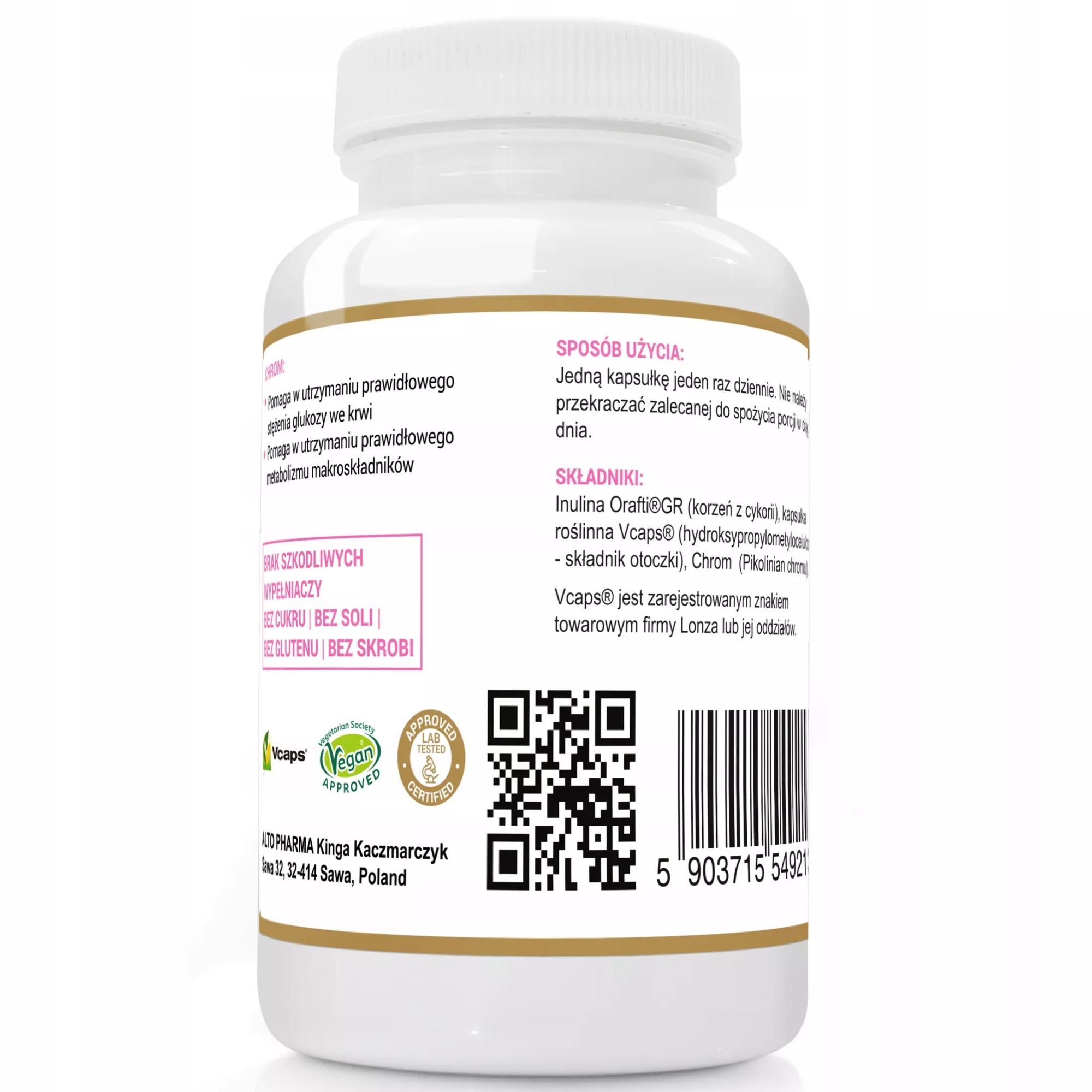 SKŁADNIKI: Inulina Orafti®GR (korzeń cykorii), kapsułka roślinna Vcaps® (hydroksypropylometyloceluloza - składnik otoczki), Chrom (Pikolinian chromu).