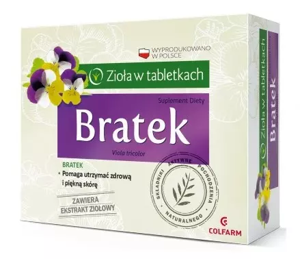 Colfarm Bratek to preparat, który poprzez zawarte w nim substancje aktywne przyczynia się do wygładzenia cery, oczyszczenia organizmu oraz wsparcia procesu przemiany materii. Wyciąg z fiołka trójbarwnego, który jest składnikiem tego suplementu diety wspiera utrzymanie zdrowej i pięknej skóry. Wygładza cerę i pomaga usuną zmiany charakterystyczne dla okresu dojrzewania. Dzięki zawartym w nim flawonoidom, wyciąg z fiołka trójbarwnego działa oczyszczająco i moczopędnie. Flawonoidy wiążą szkodliwe dla zdrowia produkty przemiany materii, uszczelniają ściany naczyń włosowatych oraz działają napotnie.