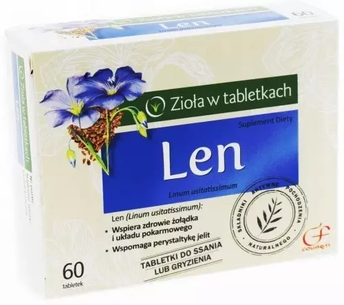 Suplement diety Len w tabletkach zawiera zmielone i odolejone nasiona lnu. Len wspiera perystaltykę jelit i poprawia ich codzienne funkcjonowanie. Suplement diety wspomaga pracę układu pokarmowego i ułatwia utrzymanie prawidłowej masy ciała. Suplement ma postać wygodnych w użyciu tabletek do ssania lub gryzienia.