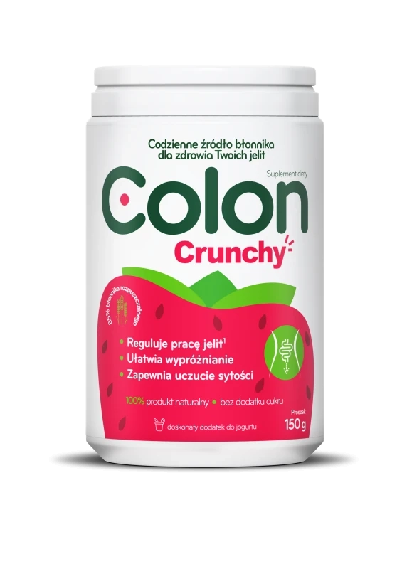 Proszek należy wymieszać przed użyciem. Wymieszać proszek w szklance wody lub smoothie i natychmiast wypić. Wypić dodatkową szklankę wody (min. 250 ml). Odmierzoną dawkę Colon Crunchy z truskawkami można również posypać np. jogurt lub skyr. Popić 1-2 szklankami wody (min. 250 ml). Należy zawsze przyjmować z określoną ilością płynu. Zbyt mała ilość płynu może powodować zaparcia. Colon Crunchy należy przyjmować co najmniej godzinę przed lub po przyjęciu leku, ponieważ łupina nasienna babki jajowatej skraca czas pasażu jelitowego i może wpływać na wchłanianie leków.