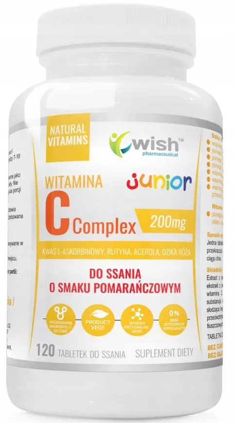 Suplement diety: Dzika róża: - wspomaga gojenie ran - pomaga w utrzymaniu ruchomości stawów - pomaga w utrzymaniu zdrowych stawów - pomaga we wzmocnieniu stawów - wspomaga system immunologiczny - wspomaga naturalną ochronę organizmu - wspomaga prawidłowe funkcjonowanie przewodu pokarmowego Witamina C: - pomaga w prawidłowym funkcjonowaniu układu odpornościowego Naturalne formy witaminy C wzbogacone o Rutynę Mega dawka: Extract z owoców aceroli (Malpighia glabra) - 100mg w tym: witamina C - 25mg (31,25%*) Ekstrakt z owoców dzikiej róży (Rosa canina) - 50mg w tym: witamina C - 35mg (43,75%*) Witamina C (kwas L-askorbinowy) - 140mg (175%*) Rutyna - 25mg *RWS - Referencyjna Wartość Spożycia Dla dzieci i młodzieży w przedziale wiekowym między 7 -18 rokiem życia. Produkt odpowiedni: dla wegan i wegetarian. 100% bezpieczny - bez skrobi, bez soli, bez cukru, nie zawiera glutenu, jaj, soi, białka mleka i laktozy NON GMO SKŁADNIKI: Extract z owoców aceroli (Malpighia glabra), ekstrakt z owoców dzikiej róży (Rosa canina), witamina C (kwas L-askorbinowy), rutyna, substancja wypełniająca: sorbitol, substancja słodząca: ksylitol, naturalny aromat, substancja przeciwzbrylająca: sole magnezowe kwasów tłuszczowych, substancja słodząca: sukraloza. OPAKOWANIE: 120 tabletek/ 82,8 g masa netto SPOSÓB UŻYCIA: Jedna tabletka jeden raz dziennie. Nie należy przekraczać zalecanej do spożycia porcji w ciągu dnia. Masa netto: 120 tabletek Suplementy diety nie mogą być stosowane jako substytut (zamiennik) zróżnicowanej diety ani zdrowego trybu życia. Nie należy przekraczać zalecanej porcji produktu do spożycia w ciągu dnia. Suplementy diety powinny być przechowywane w sposób niedostępny dla małych dzieci. Przed zastosowaniem produktu sugerujemy zapoznanie się z dokładnymi informacjami podanymi na opakowaniu lub załączonej ulotce. Warunki przechowywania: Przechowywać w szczelnym opakowaniu. W suchym i chłodnym miejscu, w sposób niedostępny dla dzieci. Chronić przed światłem. Producent: WISH PHARMA SPÓŁKA Z OGRANICZONĄ ODPOWIEDZIALNOŚCIĄ