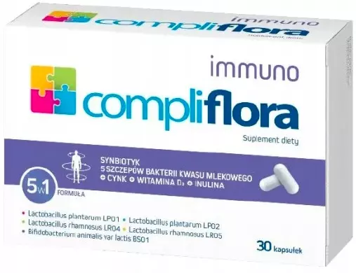 Compliflora Immuno to synbiotyk, który jest wsparciem w budowaniu długofalowej odporności organizmu. W każdej kapsułce znajduje się wyjątkowa kompozycja aż 2 miliardów bakterii kwasu mlekowego, Cynk (1,5 mg), i witamina D (1000 I.U.) zapewniają codzienne wsparcie organizmu w budowie łańcucha odporności. W skład bogatej formuły mieszanki bakterii kwasu mlekowego wchodzą następujące szcepy: Lactobacillus plantarum LP01, Lactobacillus rhamnasus LR04, Lactobacillus rhamnasus LR05 oraz Bifidobacterium lactis BS01. Produkt zawiera także inulinę, która posiada właściwości odżywcze dla bakterii.