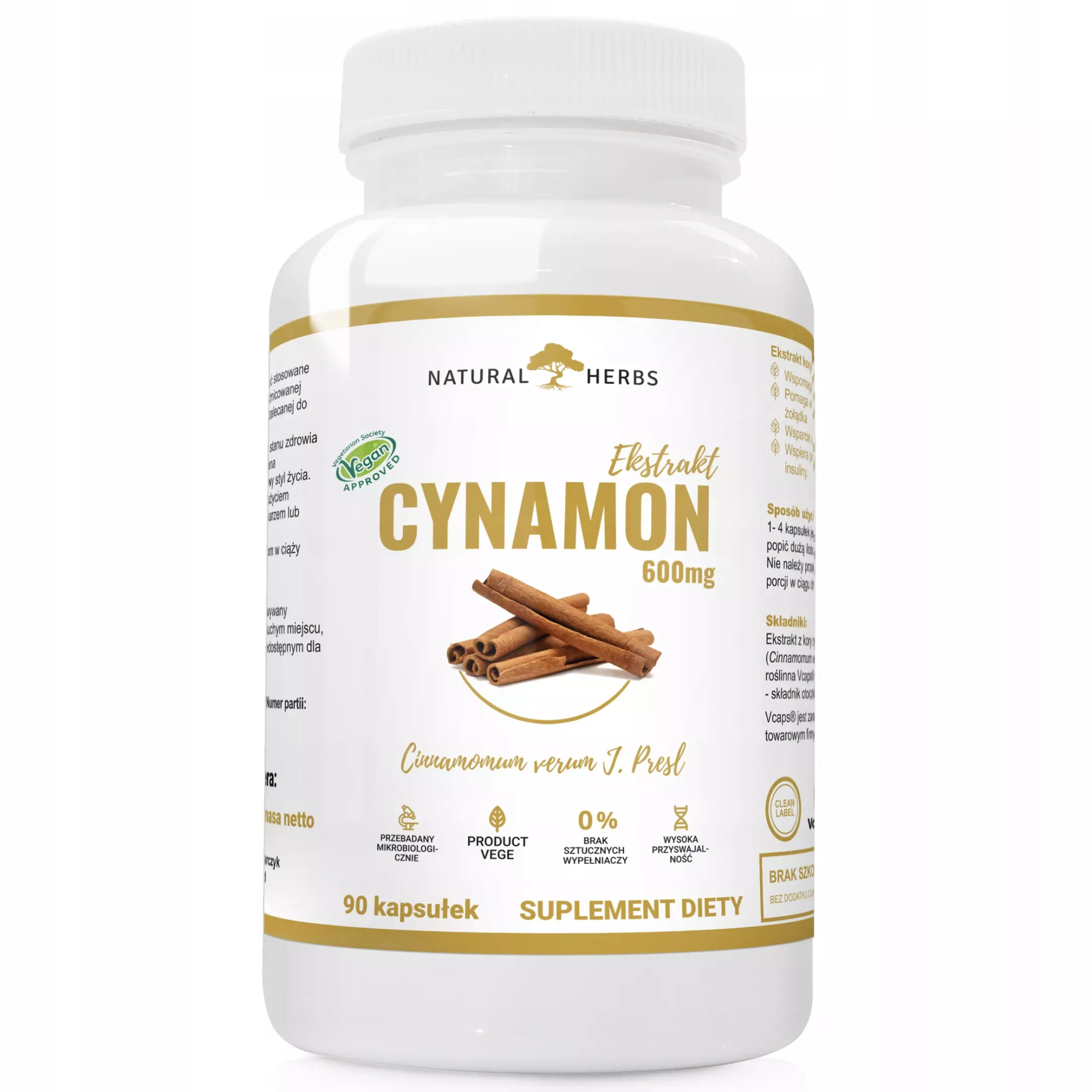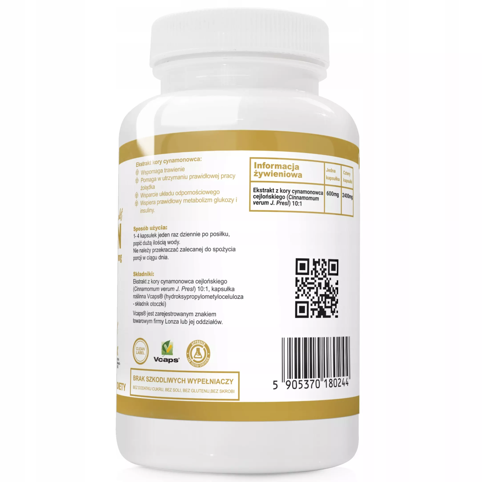 SKŁADNIKI: Ekstrakt z kory cynamonowca cejlońskiego (Cinnamomum verum J. Presl) 10:1, kapsułka roślinna Vcaps® (hydroksypropylometyloceluloza - składnik otoczki).
