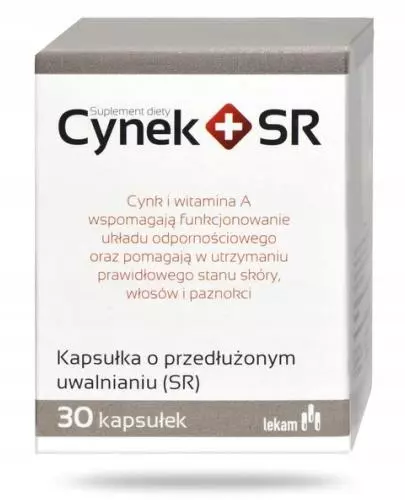 Produkt o wysokiej zawartości cynku oraz witaminy A. Kapsułki żelatynowe twarde żółto-transparentne o przedłużonym uwalnianiu - zawierają mikropeletki uwalniające w przedłużony sposób (SR) chelatowany cynk i witaminę A. Cynk pomaga w utrzymaniu prawidłowego stanu skóry, włosów i paznokci. Witamina A pomaga zachować zdrową skórą i błony śluzowe.