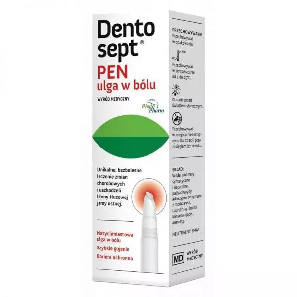 Dentosept Pen zawiera polimer, który tworzy cienką i niezauważalną warstwę ochronną, która izoluje rany i zmiany spowodowane przez pokarm, ślinę lub podrażnienie po napojach. W ten sposób można leczyć również urazy wynikające ze źle dopasowanej protezy lub aparatu ortodontycznego.