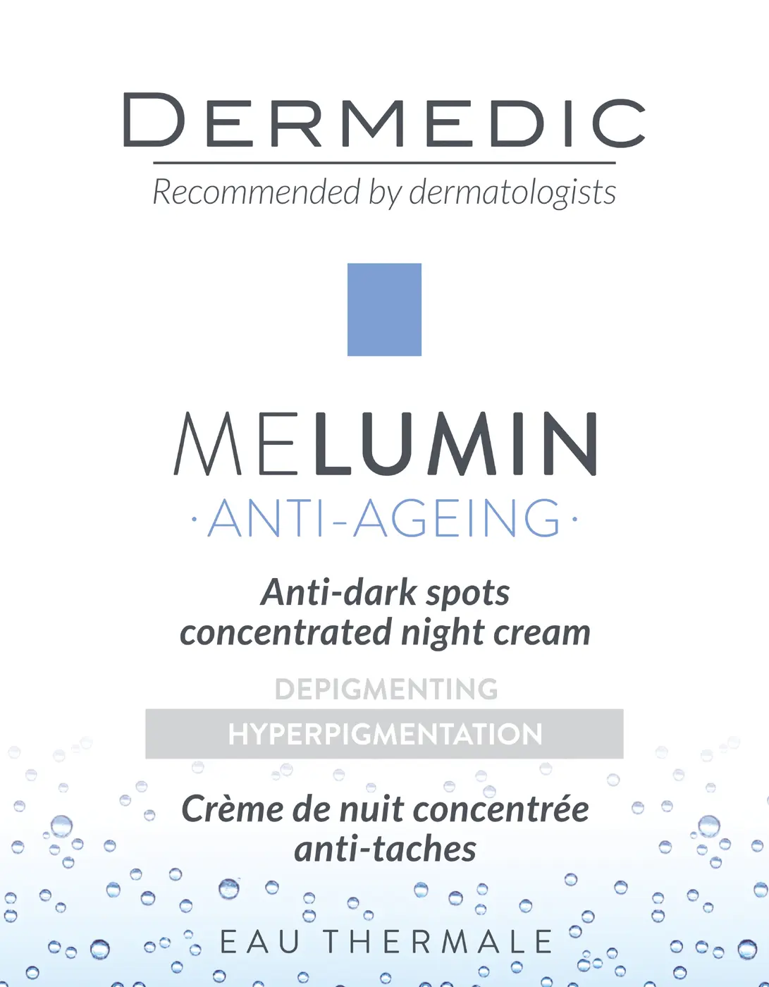 Skład: Składniki aktywne: Woda termalna, Kompleks Melumin TristageTM (Arbutyna, Lightderm, Witamina C, Niacynamid), Papaina, Witamina E, Masło Shea, Kwas Alfa -linolenowy (Olej avocado), Witamina A naturalnego pochodzenia, Alantoina.