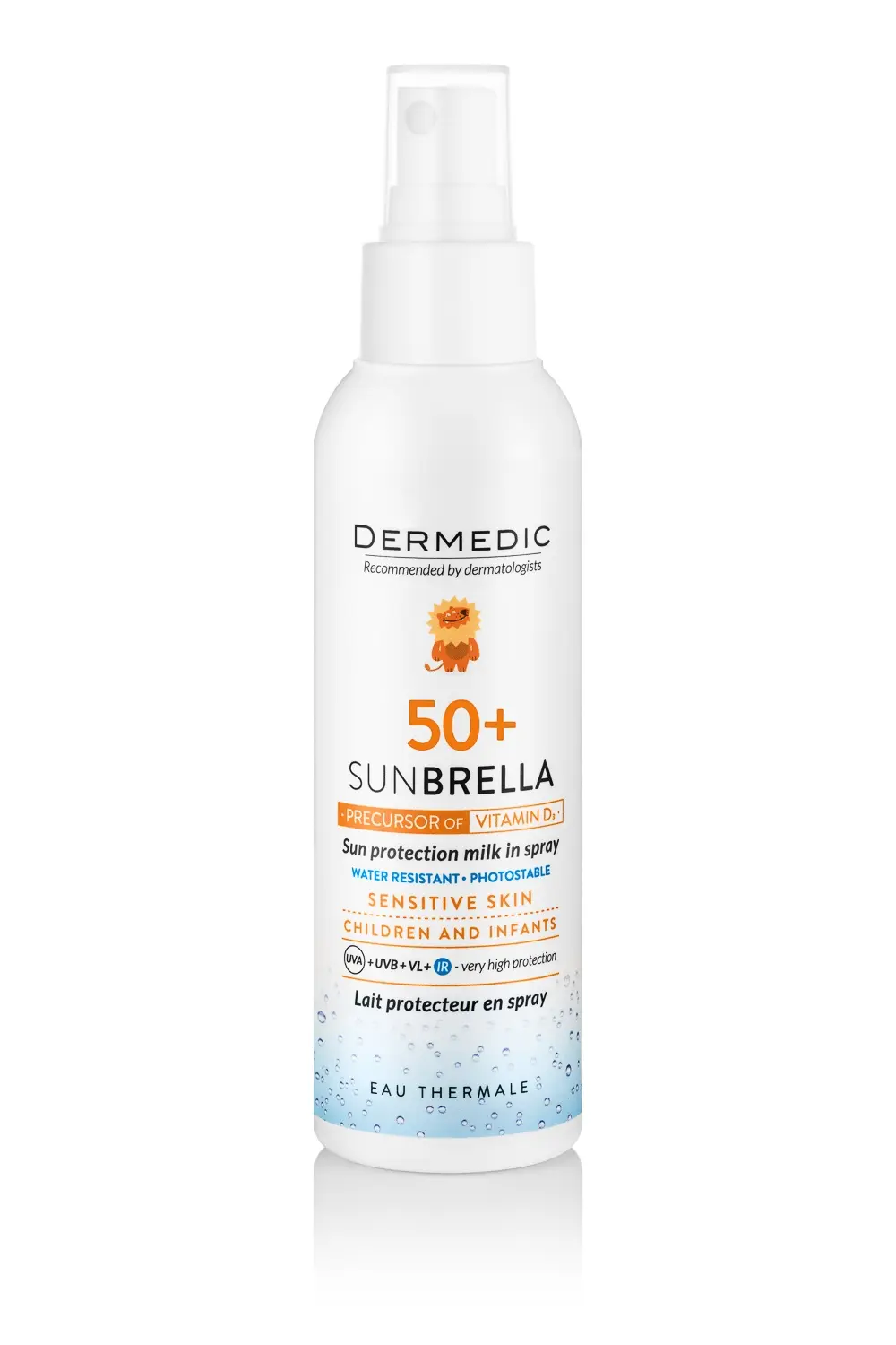Mleczko ochronne w sprayu dla dzieci z serii Dermedic Sunbrella Baby charakteryzuje się wysoką ochroną SPF (Sun Protect Factor) SPF50 . Przeznaczone jest dla najmłodszych - można je stosować już po ukończeniu 6. miesiąca życia. Produkt został wykonany z najwyższą dbałością o zdrowie dzieci przebywających na słońce. Preparat zawiera wyjątkowy składnik aktywny Aqua-proVita D3 - jest to prekursor witaminy D, który pod wpływem promieni UVB przekształca się w witaminę D3. W efekcie łagodzi podrażnienia skóry, wspiera jej funkcje barierowe oraz cykl odnowy biologicznej podrażnionego przez słońce naskórka.