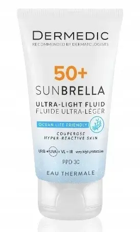 SUNBRELLA Ultralekki krem SPF 50+ stworzony specjalnie dla skóry naczyniowej i nadreaktywnej. Ten delikatny krem zapewnia skuteczną ochronę przed szkodliwym promieniowaniem UVA, UVB, VL i IR, jednocześnie wzmacniając naczynia krwionośne i redukując rumień. Dzięki fotostabilnym filtrom SPF 50+ chroni skórę wrażliwą przed negatywnymi skutkami działania promieni słonecznych.