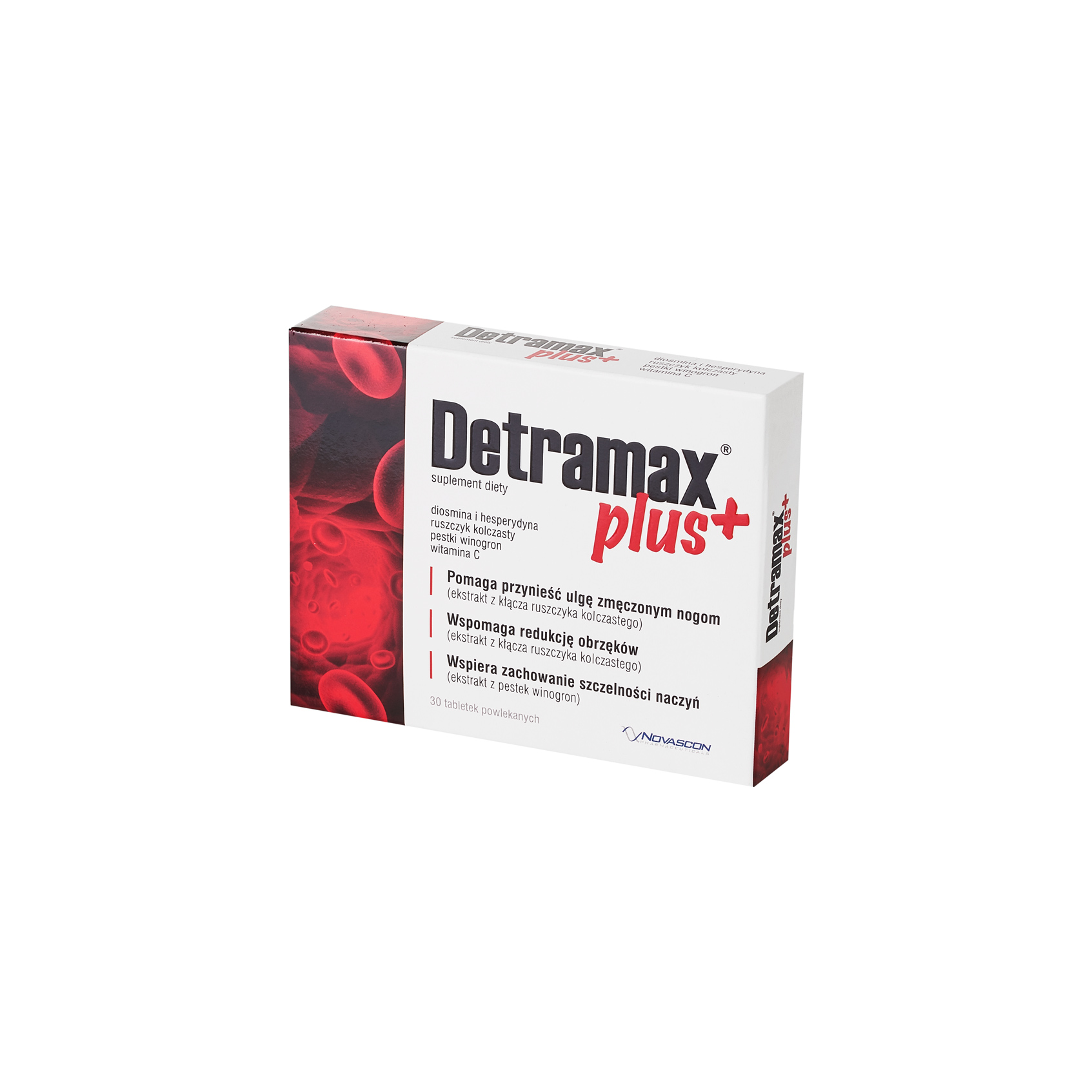 Detramax Plus pomaga przynieść ulgę zmęczonym nogom oraz wspomaga redukcję obrzęków o podłożu fizjologicznym (ekstrakt z kłącza ruszczyka kolczastego). Ze względu na obecność ekstraktu z pestek winogron wspiera zachowanie szczelności naczyń, a zawarta witamina C wspomaga produkcję kolagenu w celu zapewnienia prawidłowego funkcjonowania naczyń krwionośnych. Zawiera także diosminę i hesperydynę.