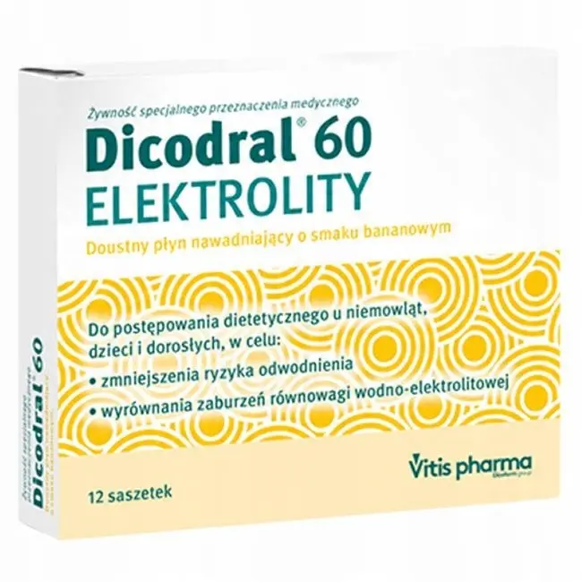 Dicodral 60 elektrolity to produkt przeznaczony do postępowania dietetycznego. Dzięki zawartości elektrolitów oraz glukozy ma postać płynu o działaniu nawadniającym. Charakteryzuje się osmolarnością wynoszącą 222 mOsm/l. W efekcie skutecznie ogranicza ryzyko wystąpienia odwodnienia. Ponadto przywraca równowagę wodno-elektrolitową (zaburzoną w przypadku np. długotrwałej biegunki). Dicodral 60 elektrolity ma postać saszetek przeznaczonych do sporządzania płynu do picia. Posiada pyszny, bananowy smak.