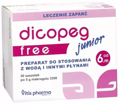Dicopeg Junior Free to wyrób medyczny w postaci proszku do sporządzania roztworu doustnego, zalecany w leczeniu przewlekłych zaparć u dzieci. Można go również stosować w sporadycznych przypadkach nieregularnej pracy jelit. Preparat zmiękcza stolec, ułatwiając wypróżnianie, nie powodując przy tym skurczów, bólów brzucha ani nagłego parcia. Przeznaczony dla niemowląt od 6. miesiąca życia i dzieci.